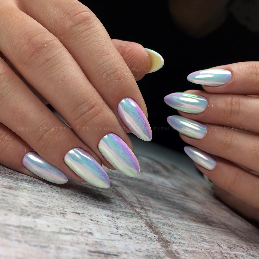 Для создания на ногтевых пластинах оригинального хромированного эффекта используется зеркальная втирка. Настоящий калейдоскоп из радужных переливов достигается после использования голографического пигмента, который в свою очередь можно разделить на несколько типов. К наиболее распространённым видам голографической втирки относятся втирка-хамелеон, пудра с интересным названием «майский жук», призма, создающая необыкновенный эффект преломления света и алмазная втирка. Чтобы придать ногтевым пластинам особое нежное сияние и мягкий блеск стоит применять жемчужную втирку. Любой из вариантов смотрится по-своему потрясающе и не оставит ваши ручки без внимания.