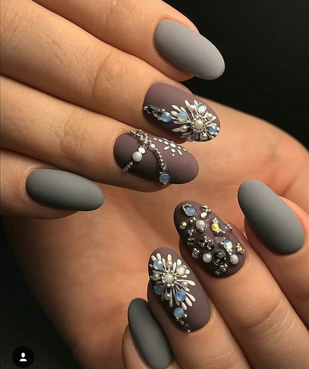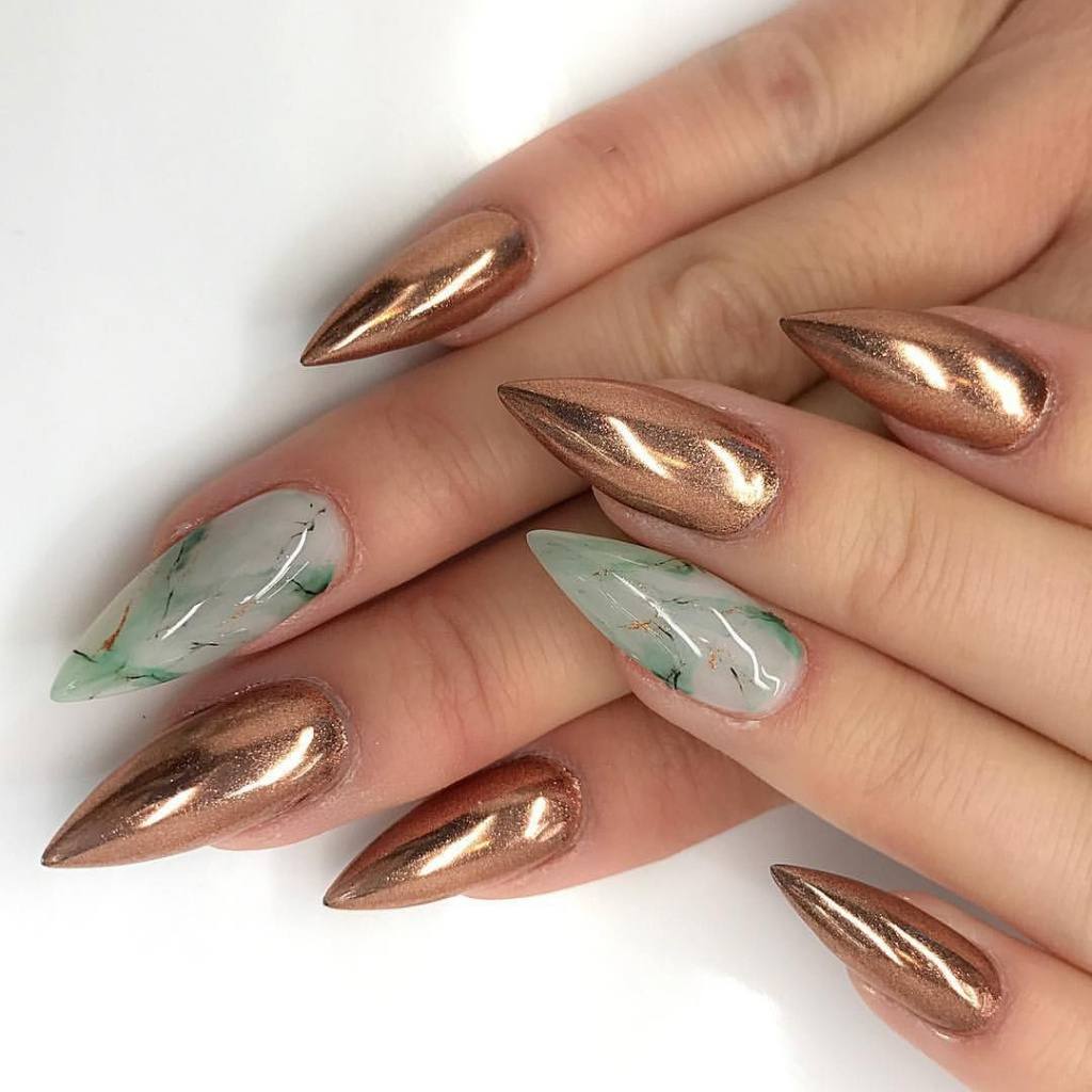 Важно добиться такого эффекта, чтобы ногти были похожи на кусочки стекла или льда. Для основы отлично подойдет молочный оттенок, а текстуру камня можно создать с помощью нежно-серого, белого, мятного, золотого или серебряного
