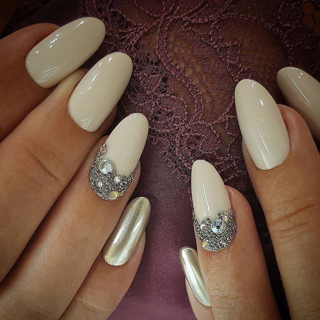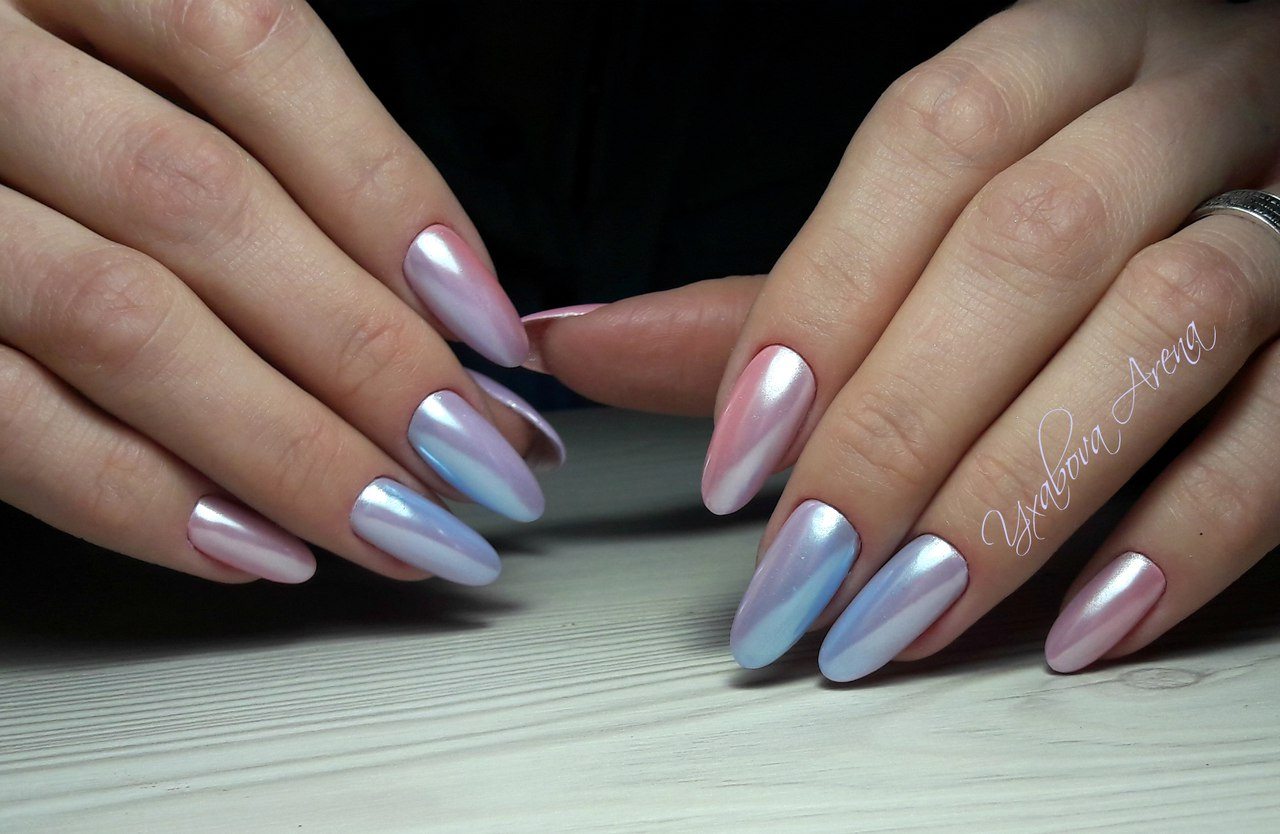Обратите внимание как нежно и женственно смотрится втирка на нюдовой или пастельной базе. Таким образом можно оформить все ногти на руке или выбрать пару акцентных