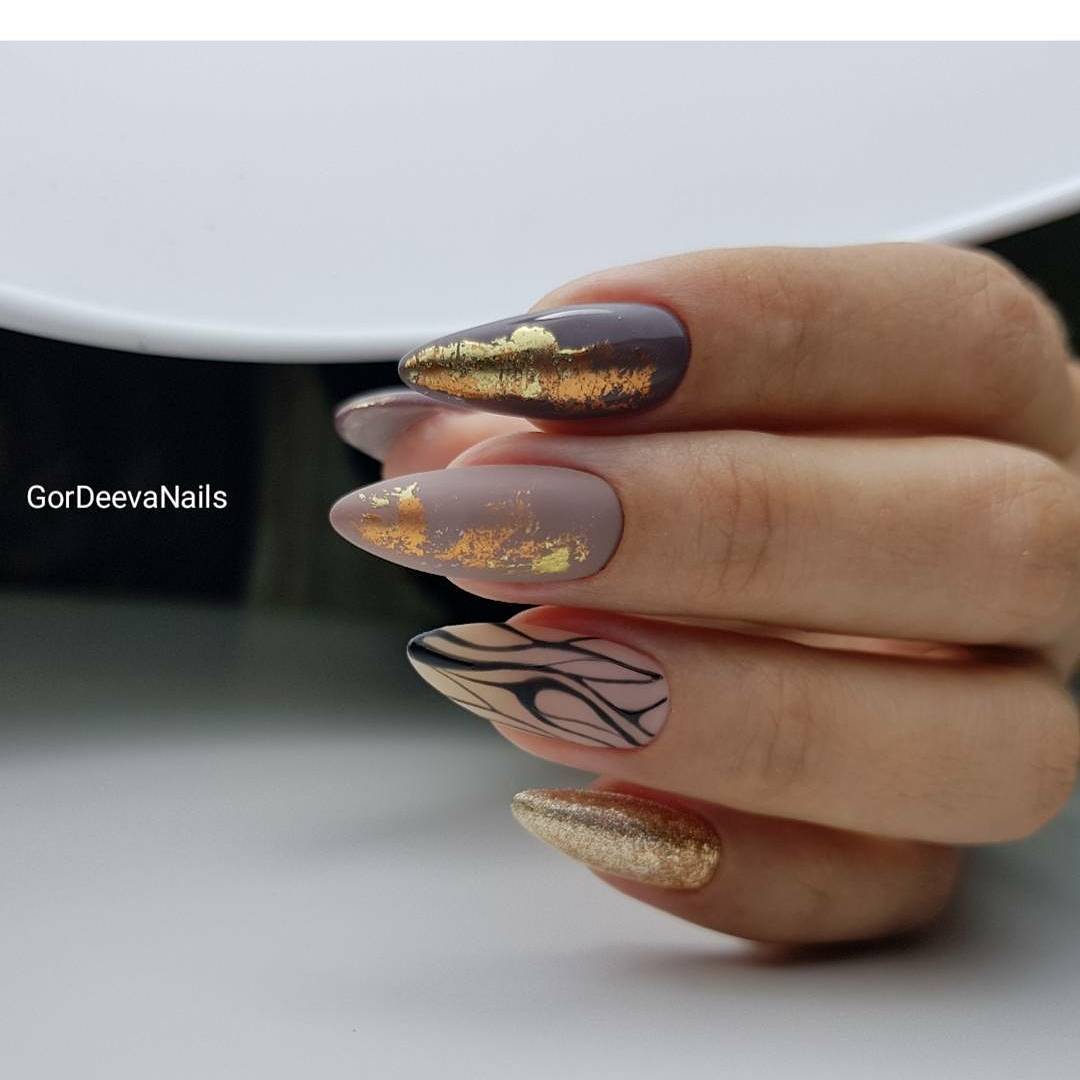 Хаотично разбросанные по пластине элементы серебристой или золотой фольги придают маникюру особой элегантности, что очень нравится парням. Специалисты рекомендуют комбинировать их с бежевым или молочным лаком.