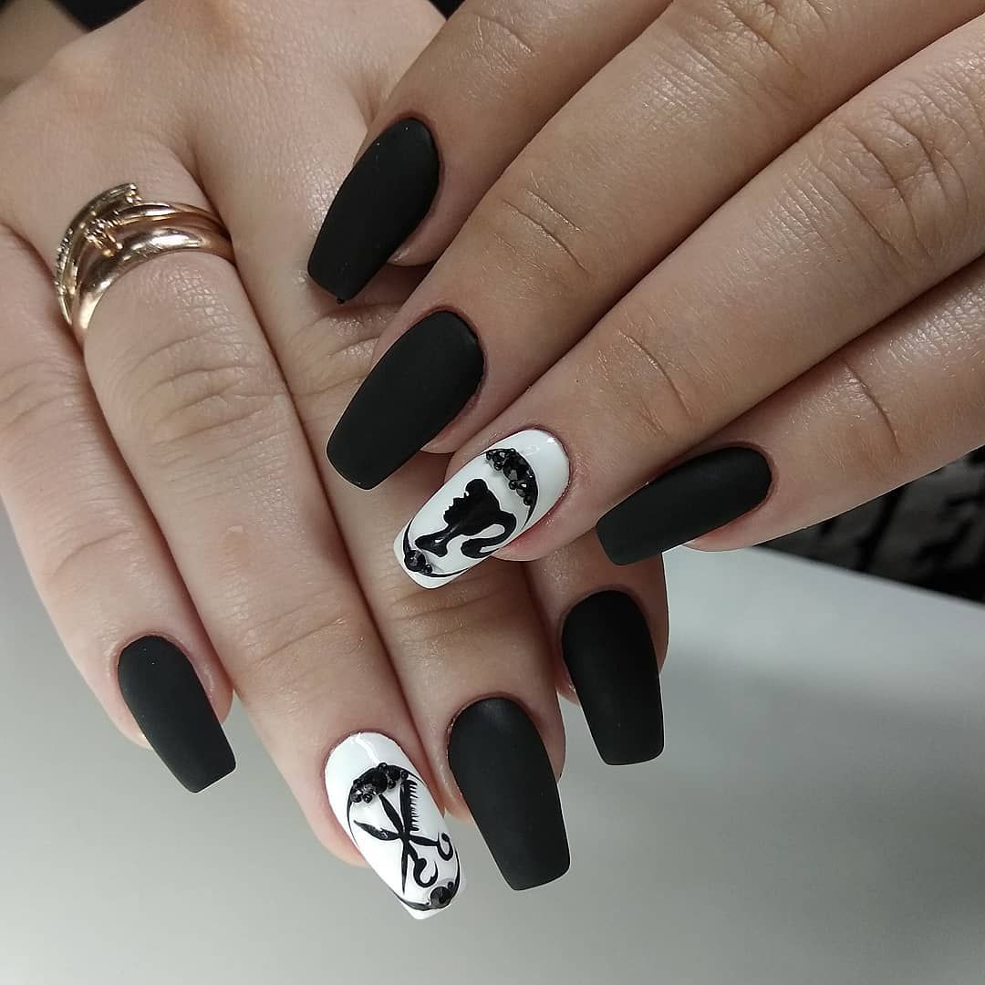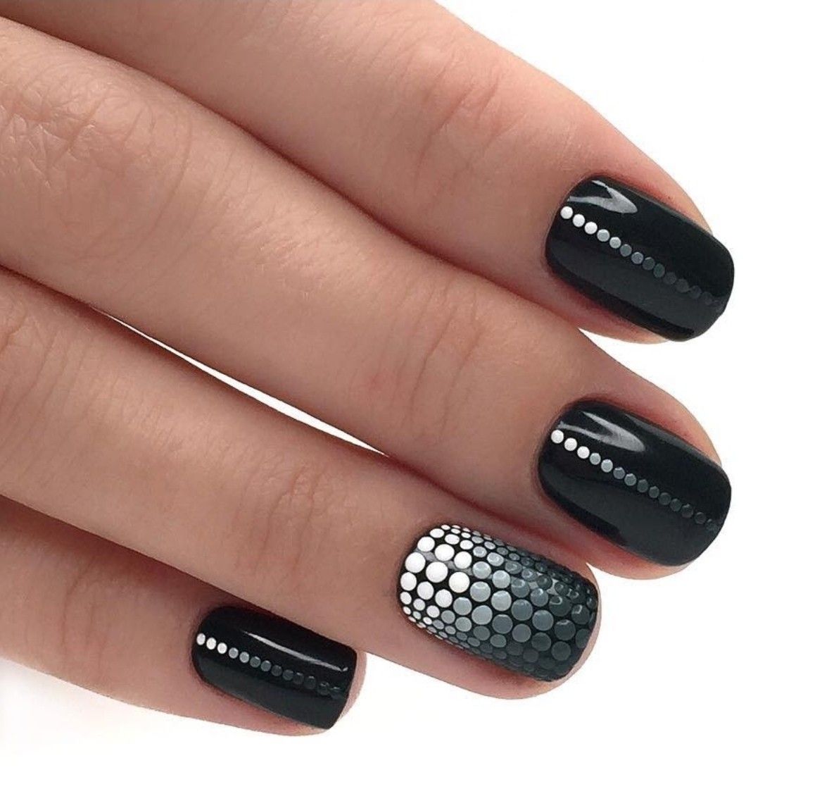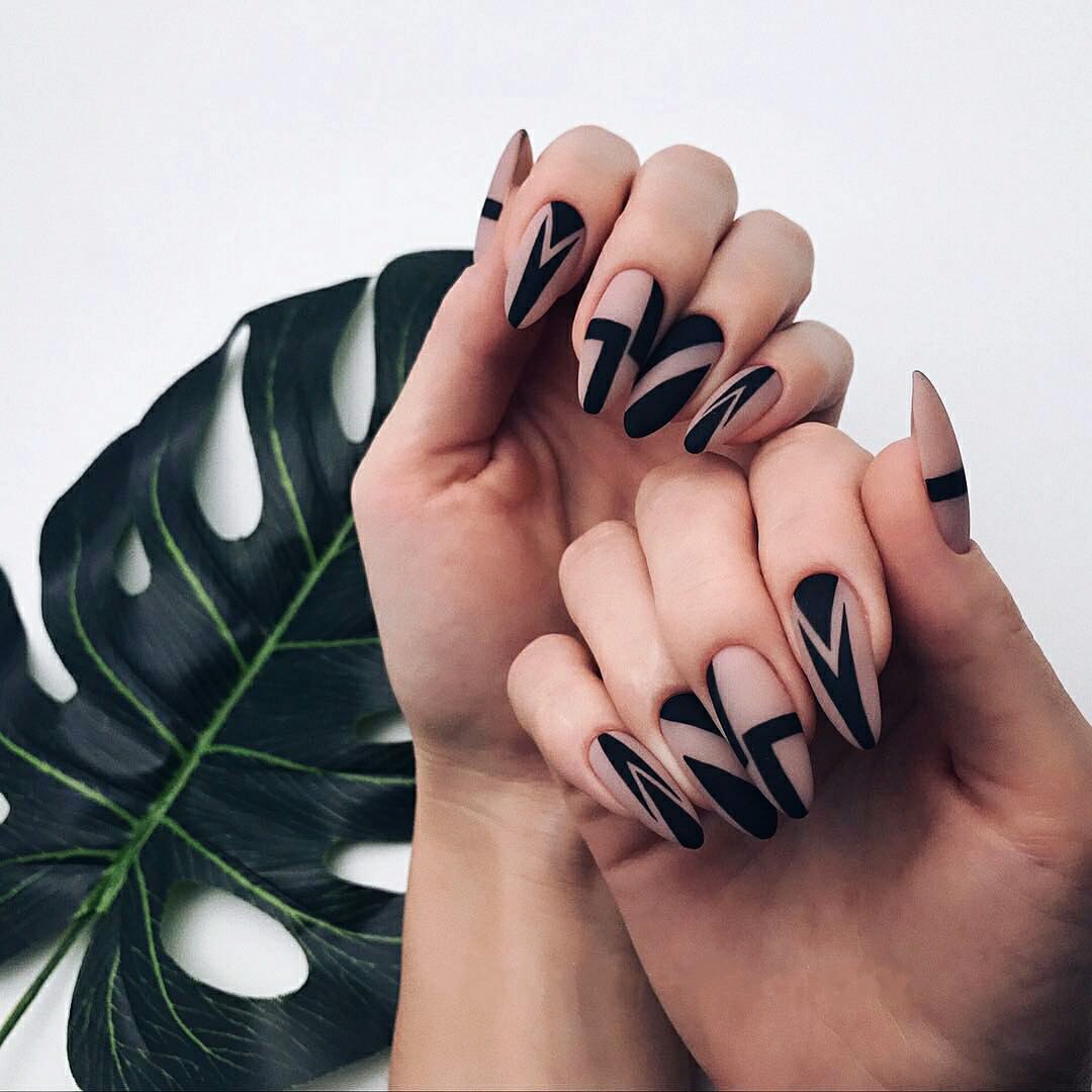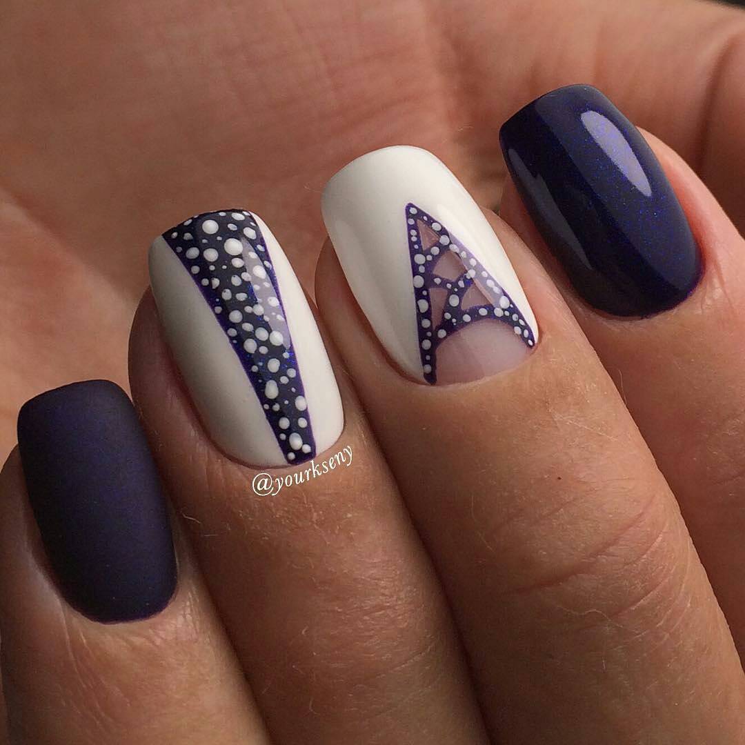 При выборе этого дизайна лучше придерживаться минимализма. Популярные варианты маникюра – черная клетка на белом фоне, композиция из линий и треугольников.