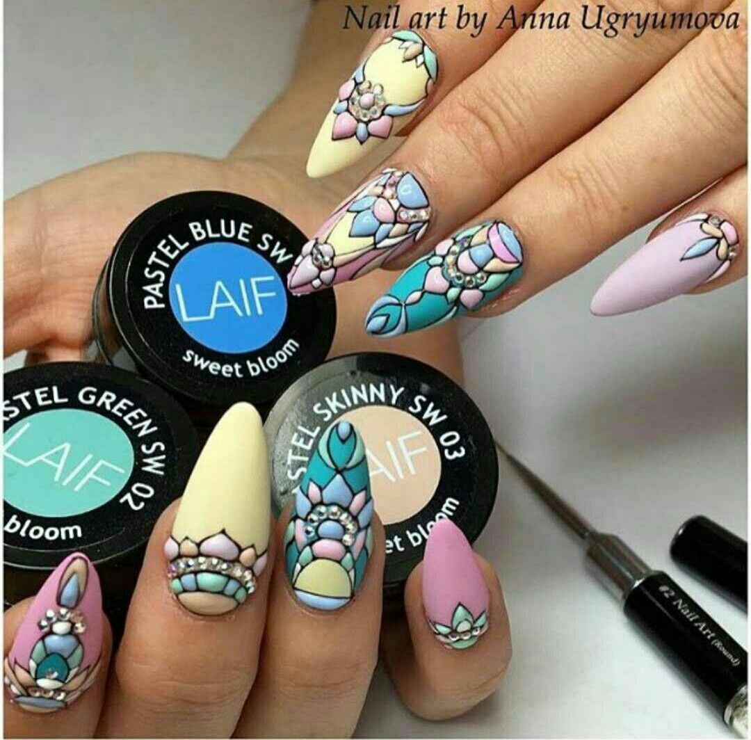 Самый простой витражный дизайн выглядит как множество осколков, соединенных в единое целое. Создать такой узор не составляет труда. Используйте для дизайна светлые пастельные оттенки гель-лака, черный, белый или серебряный гель-лак для прорисовки перегородок. Закрепите дизайн прозрачным витражным гелем.