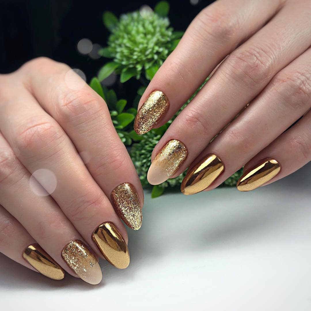 Золотой цвет всегда ассоциируется с богатством, роскошью и праздником. Он отлично подойдет для новогоднего маникюра, создавая модный и элегантный образ. Вы можете выбрать золотистый лак или использовать прозрачное покрытие с золотистыми блестками для создания эффекта золота. Для усиления зеркального эффекта воспользуйтесь лаком, фольгой или зеркальной пудрой.