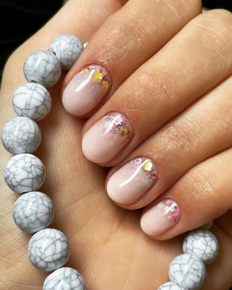 Техника градиента или омбре — это идеальный способ добавить пастельный маникюр с блестками. Нанесите на ногти несколько пастельных оттенков и создайте градиентный эффект. Добавьте блестки в конце каждого ногтя, чтобы создать эффект искрящейся поверхности.