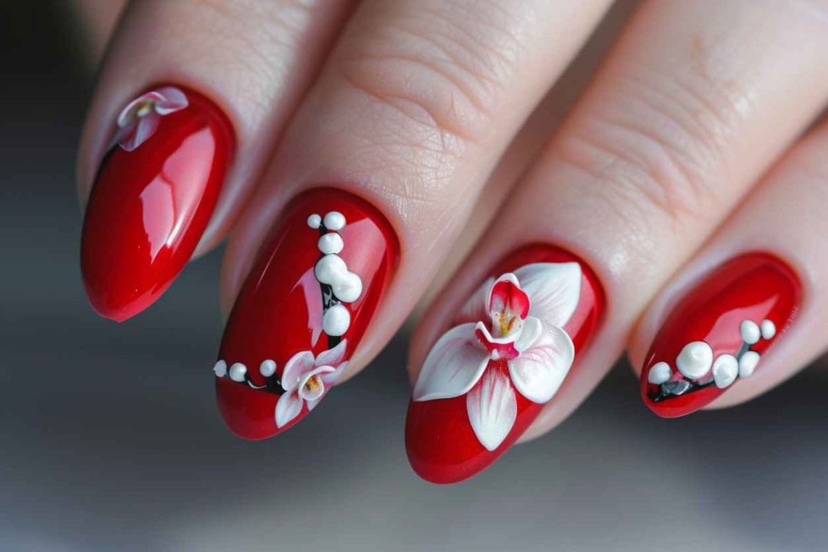 Четвертое место по-популярности, занимает красный дизайн со всевозможными стразами и блестками. Блистать и быть в центре внимания — любят наверное все девушки без исключения. Поэтому, этот вид дизайна регулярно занимает одно из лидирующих мест в модном ТОПе.
