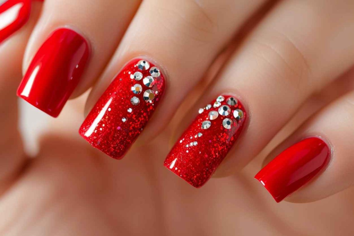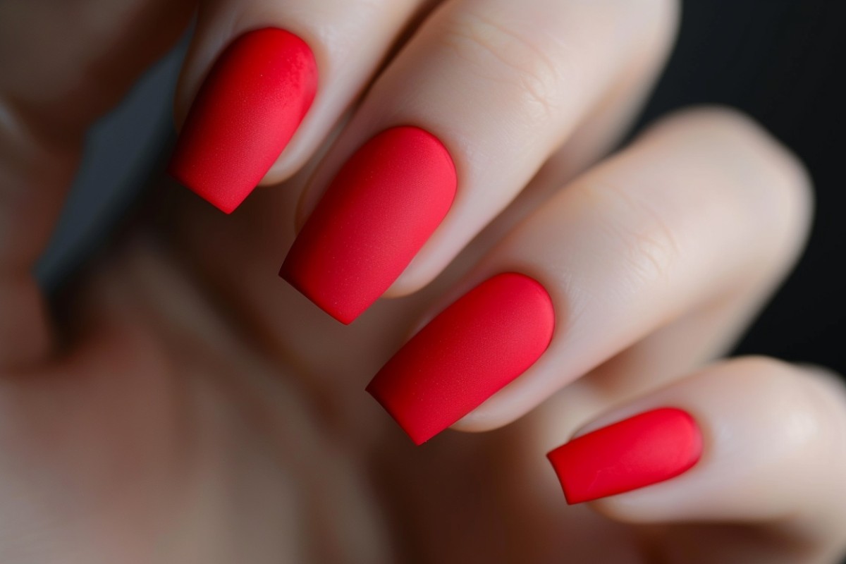 Очень стильно смотрятся красные матовые ноготки, украшенные стразами, бульонками или блестками.