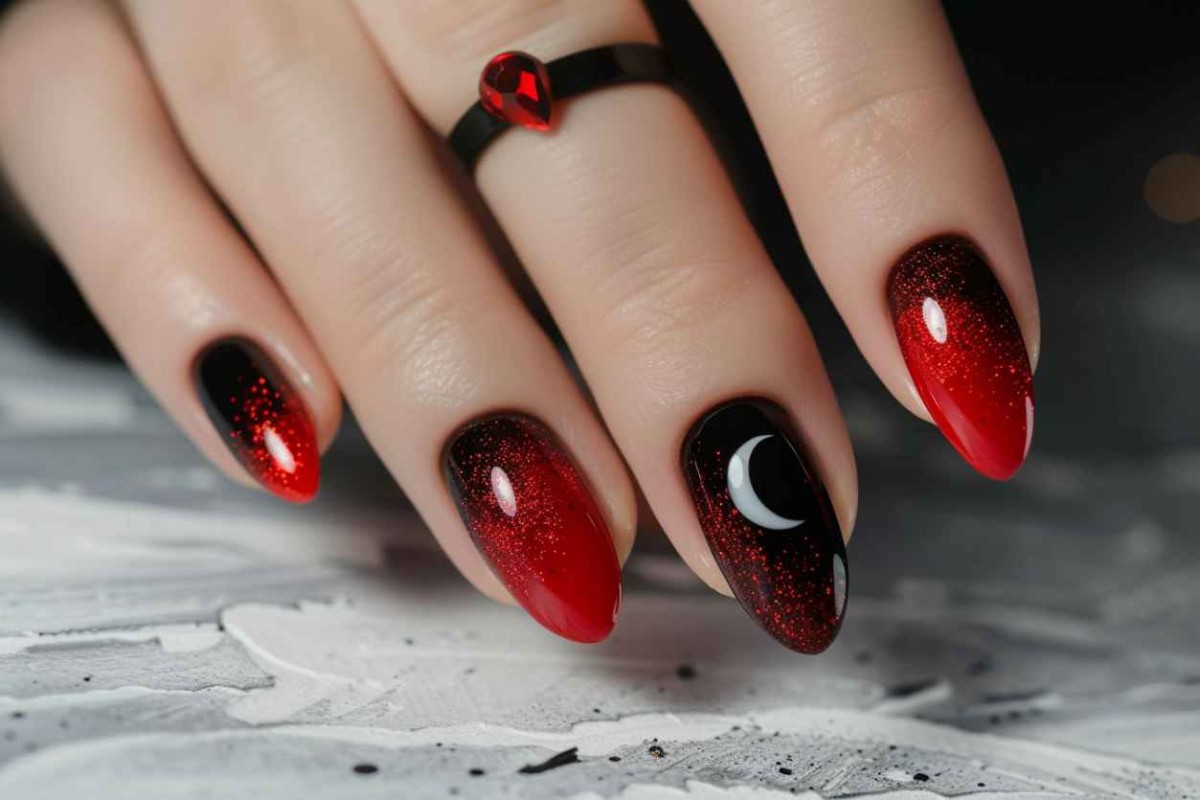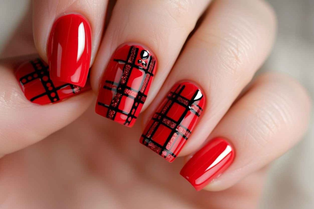 Также, очень популярным является сочетание красного дизайна с растяжкой из серебряных или золотых блесток.