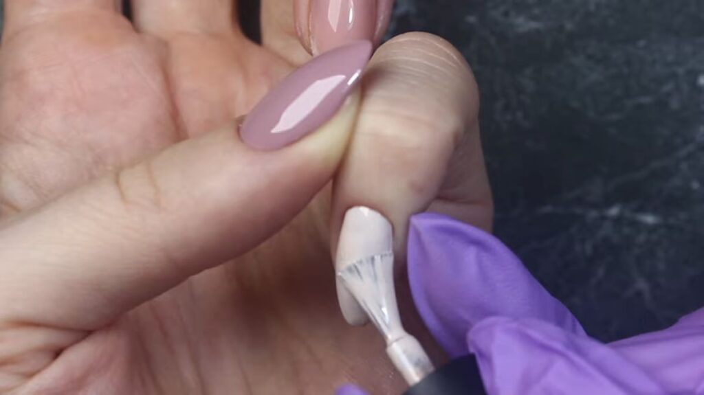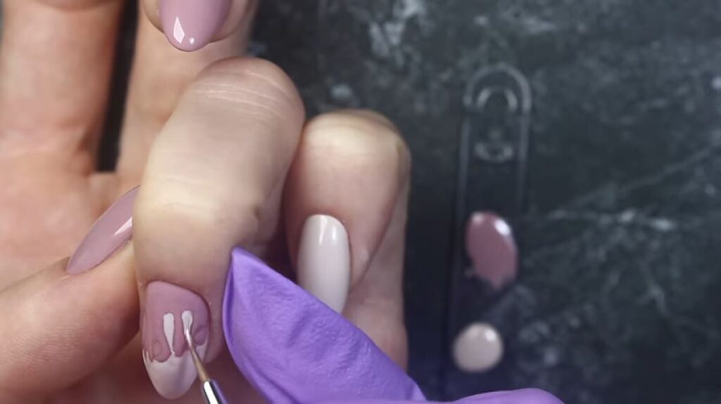 Ноготки покрывают лаками разных оттенков, например, по 2 ногтя нежно-розовым, по 2 – пудрово-сливовым, безымянный палец – белым или молочным.