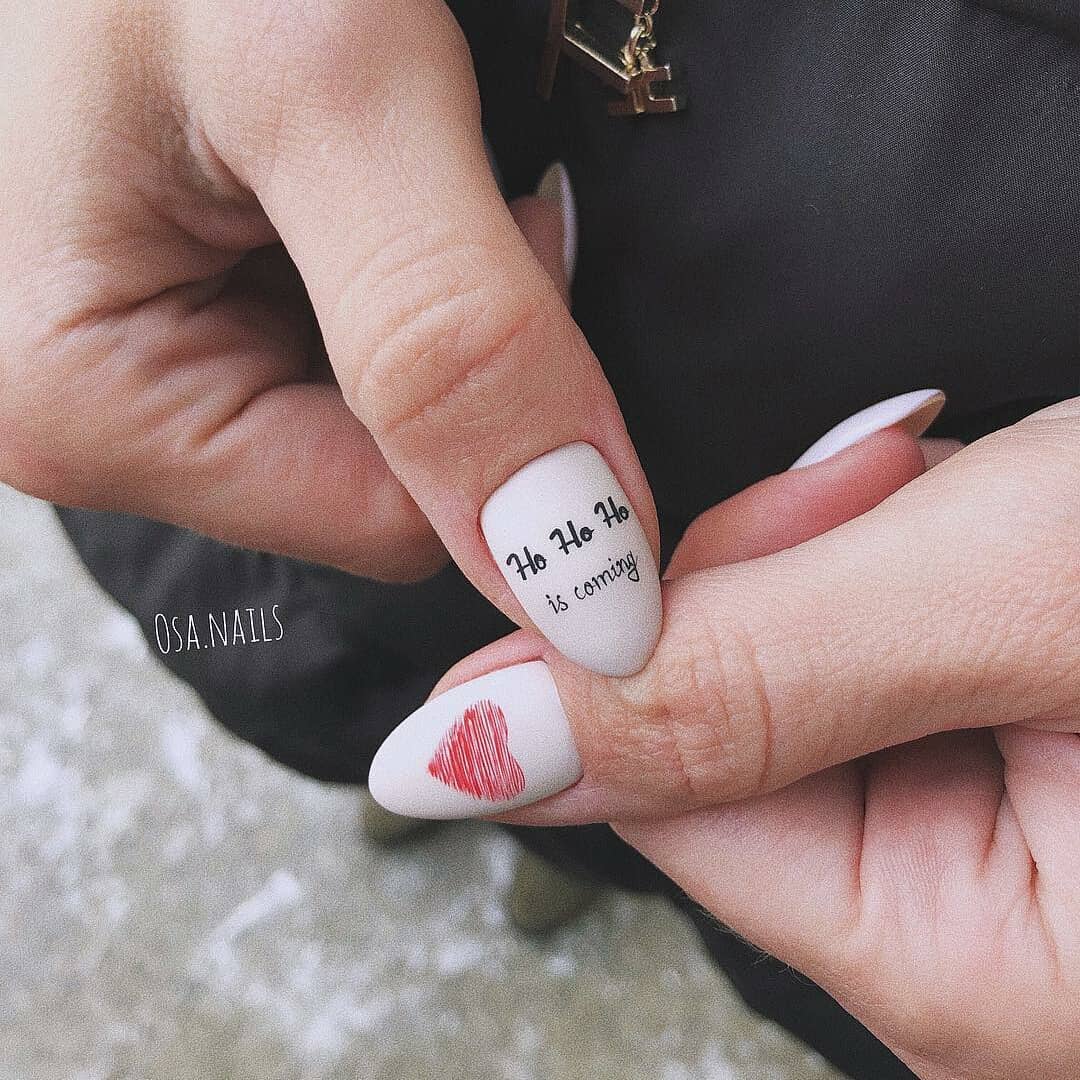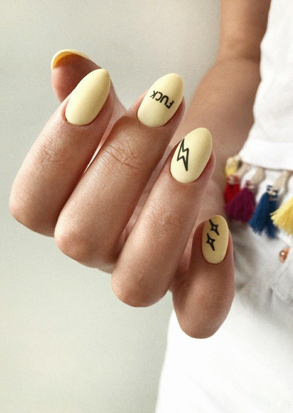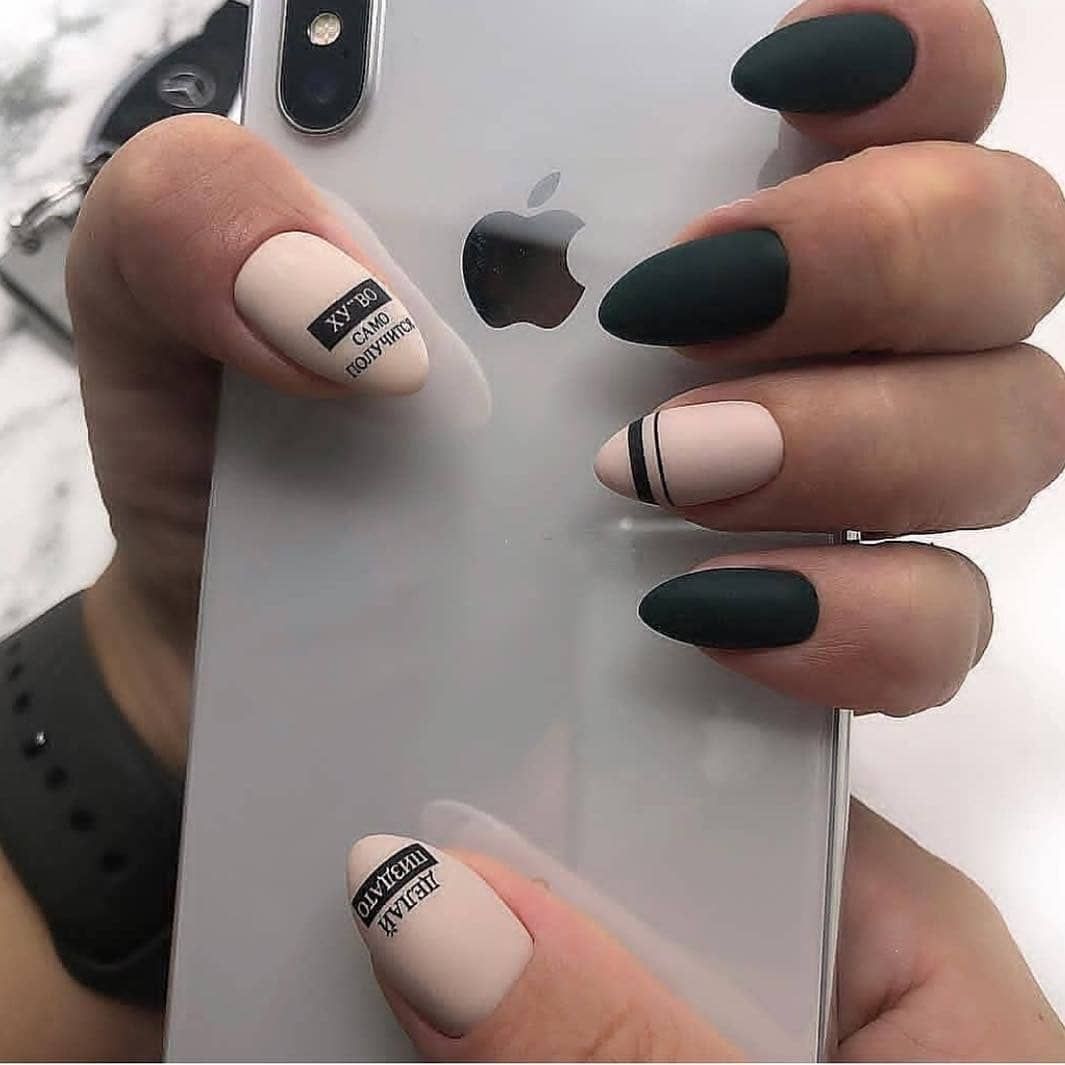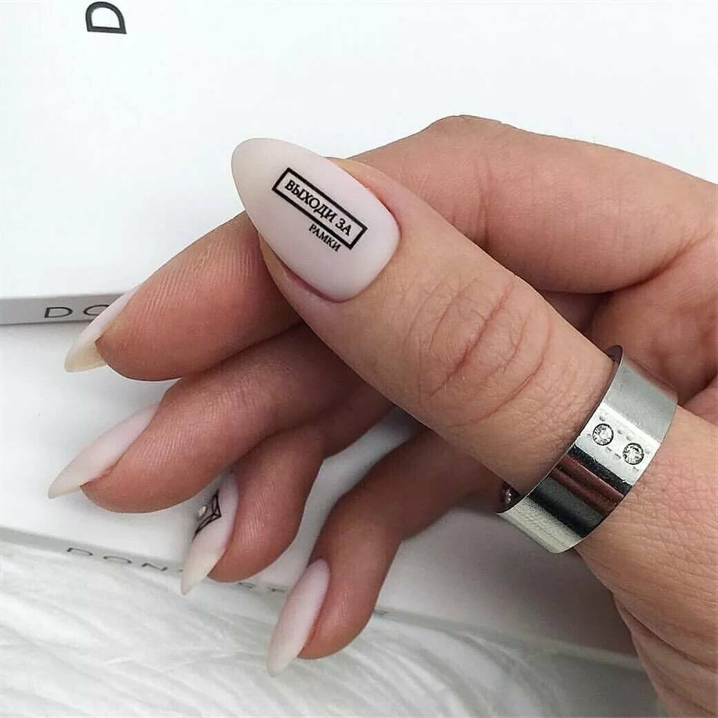 Следующий дизайн, пожалуй, один из самых популярных вариантов оформления ногтей с использованием декора в виде надписей. 2023 год богат на интересные матовые дизайны. Вот один из них.