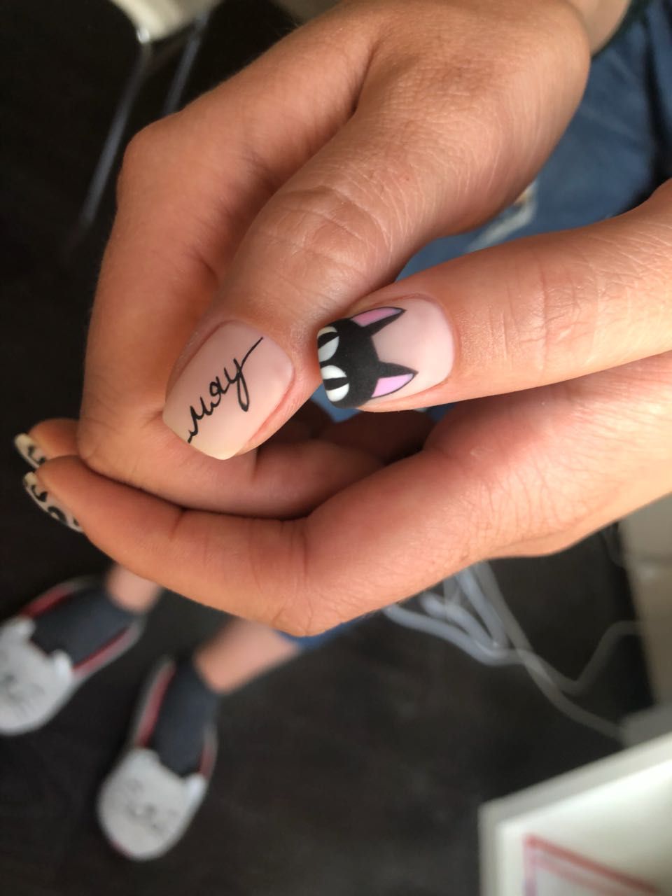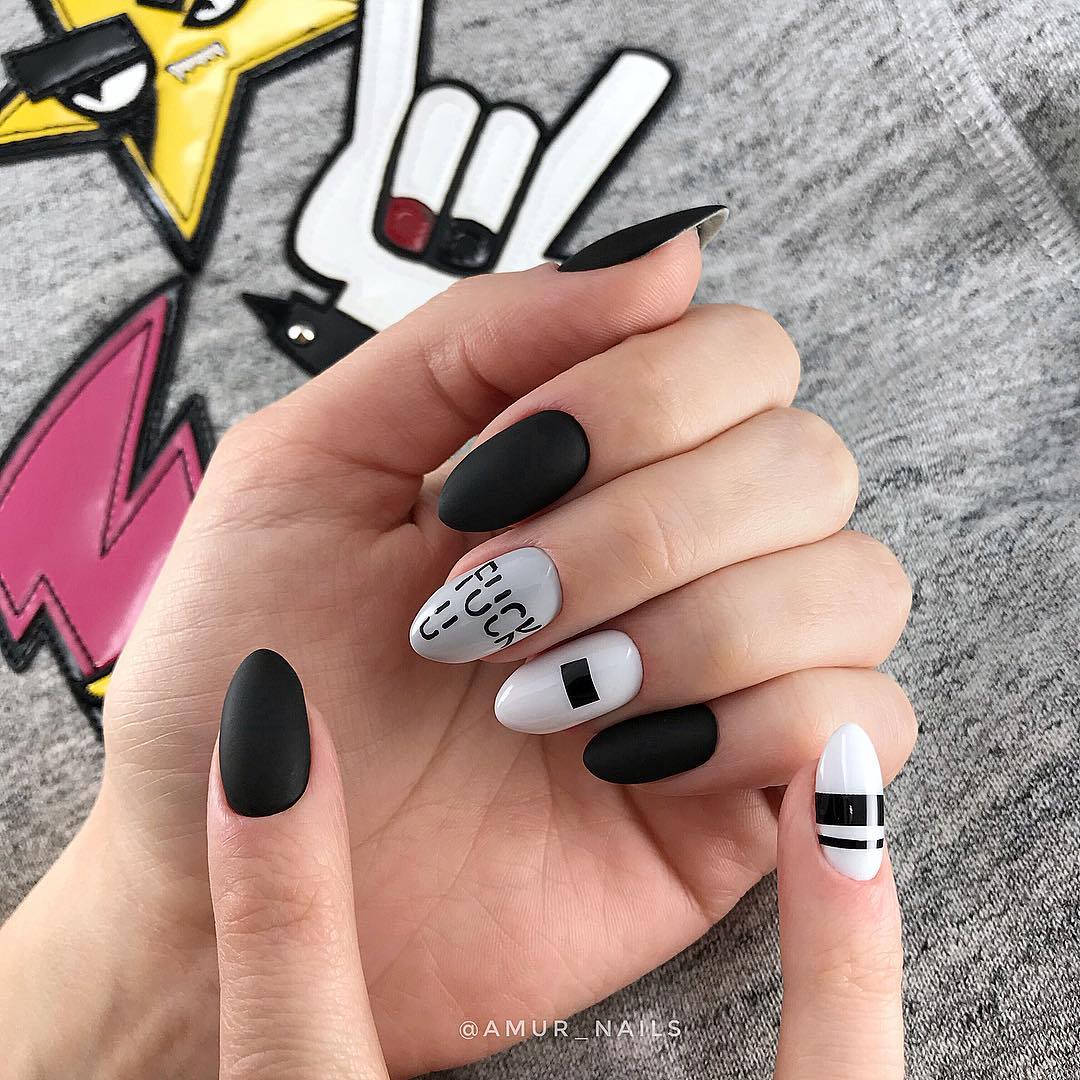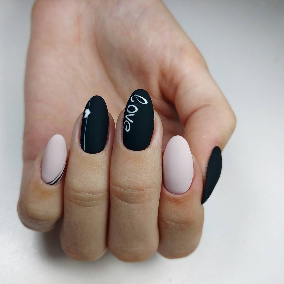 Следующий дизайн, пожалуй, один из самых популярных вариантов оформления ногтей с использованием декора в виде надписей. 2023 год богат на интересные матовые дизайны. Вот один из них.
