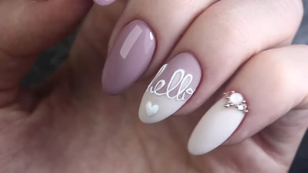 На розовом лаке тонкой маникюрной кистью пишут слово «Hello» или другой вариант надписи. Пространство выше слова ещё раз прокрашивают розовым, ниже – заполняют молочным лаком для большей декоративности.