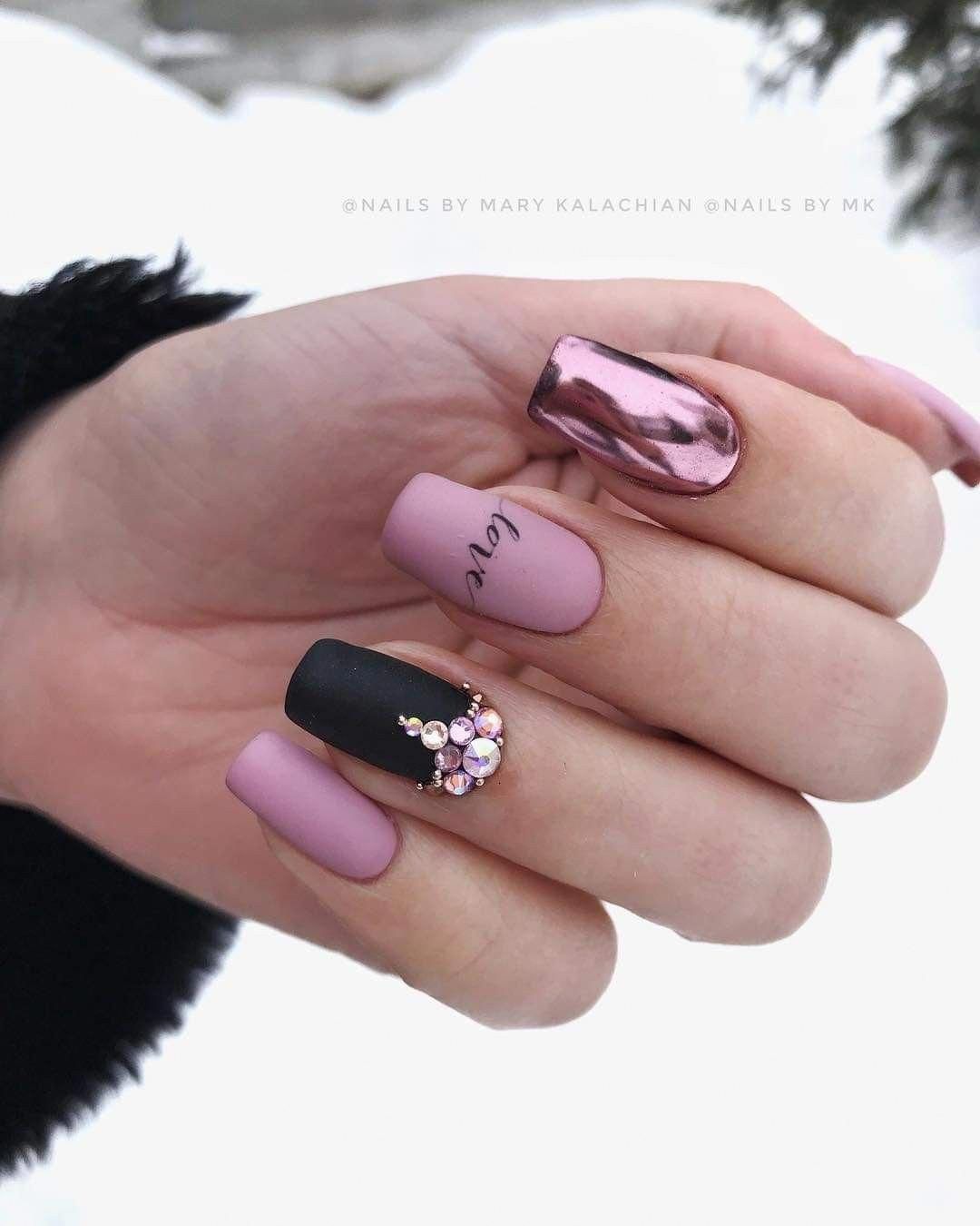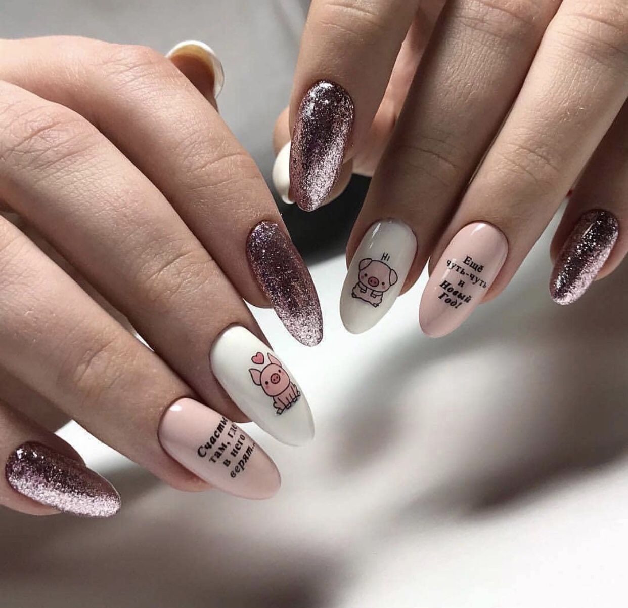 В целом надписи на ногтях — самодостаточный вариант маникюра. Но если хочется немного китча, добавьте блеска и яркости — блесток и страз. Здесь действует правило лаконичности. Все же блестящий дизайн и надписи из разных трендов