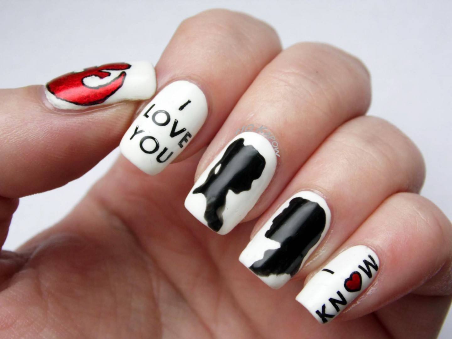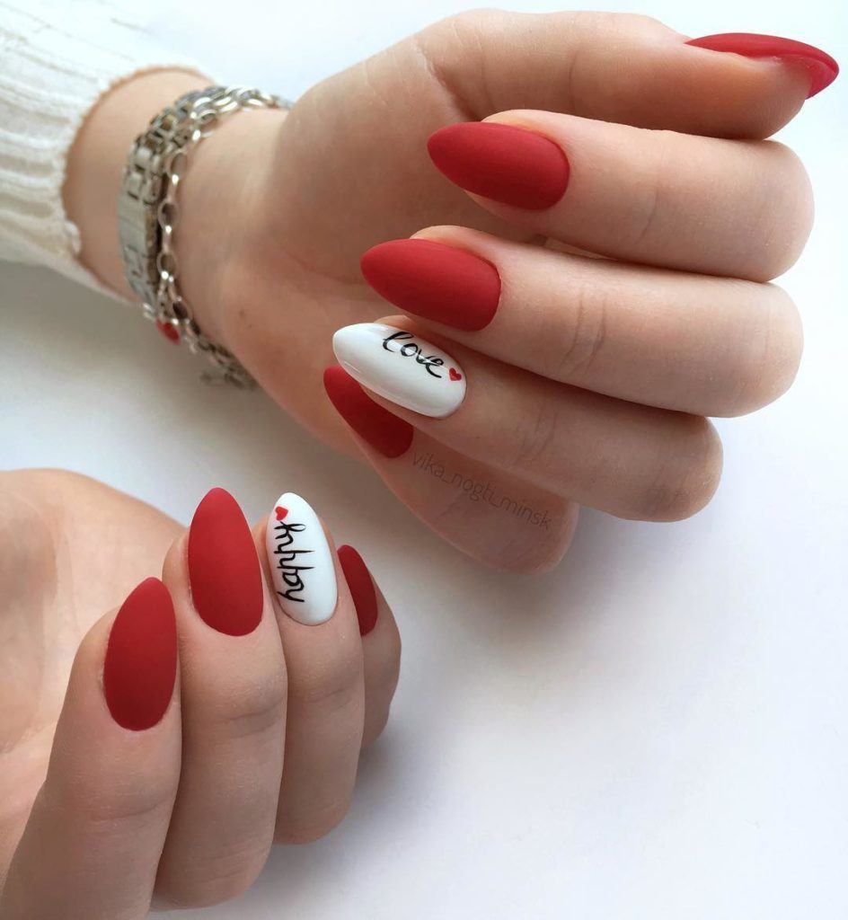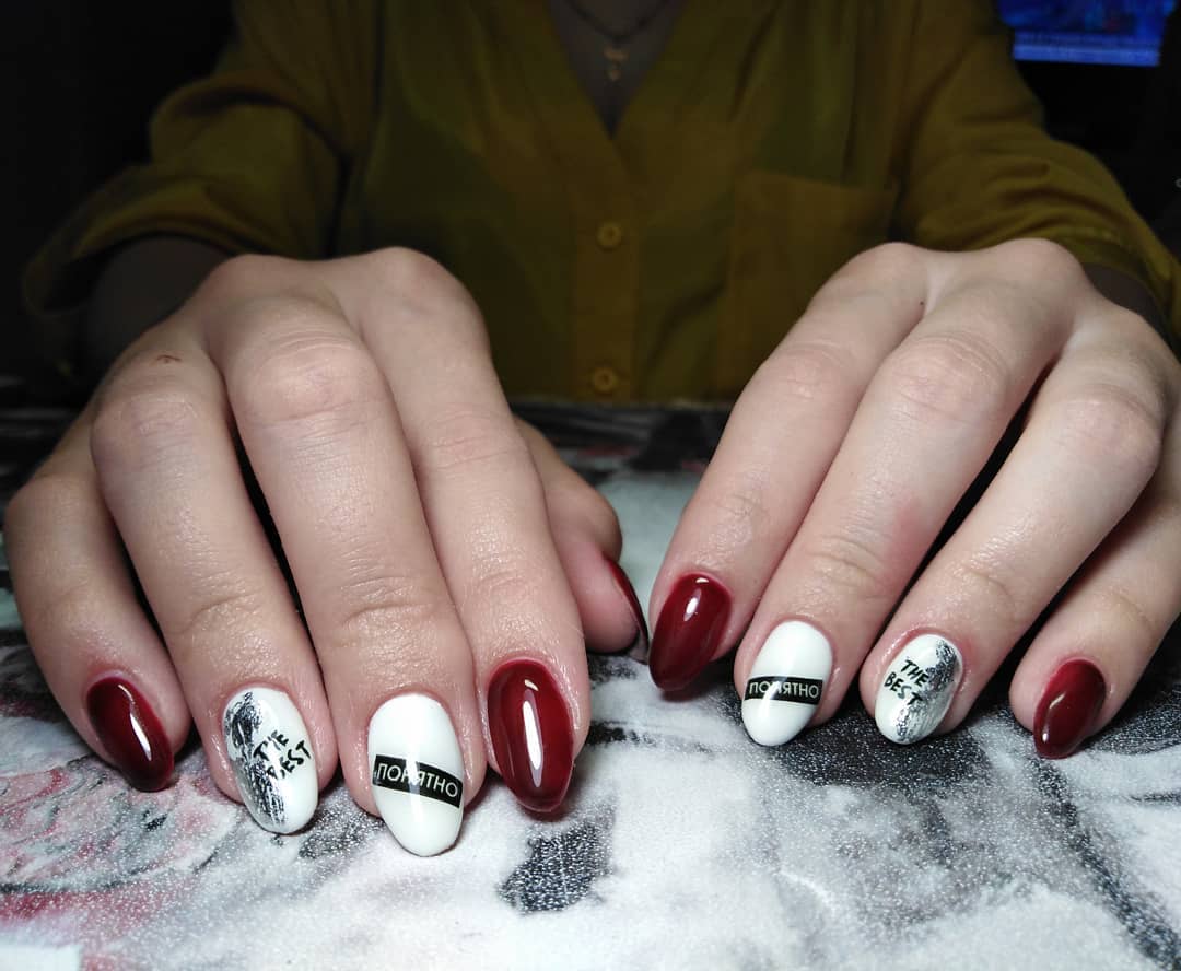 Маникюр с надписями на каждом ноготке не оставит равнодушным тех, кто влюблен или хочет донести до своего партнера слова любви, блестяще подойдет «LOVE» на ноготках и «You» на большом пальце, в особенной цветовой гамме: белый-черный-красный.