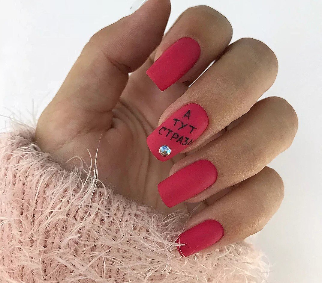Дизайн с русскими фразами и словами зачастую очень дерзкий. Он привлекает большое количество внимания окружающих. Выбирая такой вид дизайна, стоит быть готовой к эмоциям и вопросам коллег и близких. Это достаточно модный тренд, который позволяет уйти от англоязычных слов в нашем обиходе.