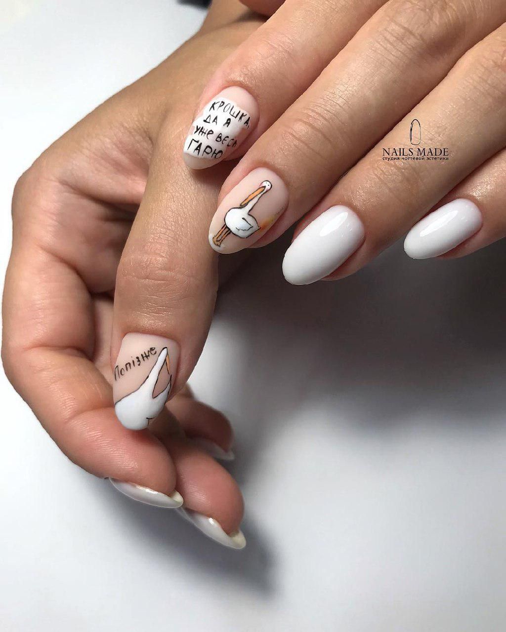 Выполнить маникюр со смешными надписями готова не каждая девушка. Такой дизайн явно выглядит неординарно и непривычно. Но если вы готовы быть объектом пристального внимания, то без опасений выполняйте на своих ноготках смешные надписи.