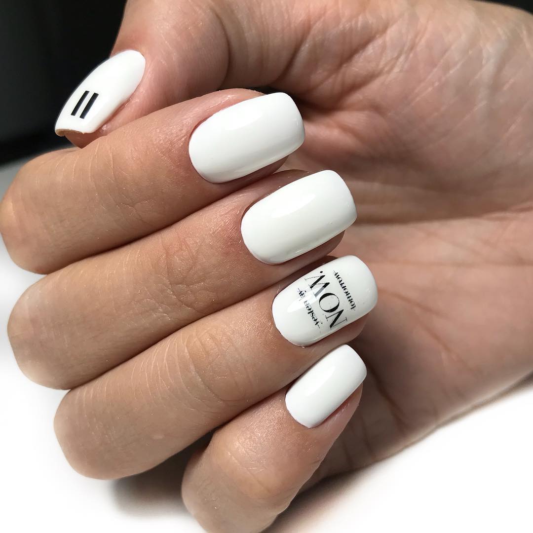 Что касается надписей, то тут также нет никаких ограничений. Создавайте монохромные нейл-арты с черным гель-лаком или выполните надписи яркими оттенками. Белый маникюр с надписями, в отличии от остальных, можно дополнить флористикой, полосками, треугольниками, фольгой, стразами и другим декором. Белый дизайн ногтей – отличный вариант для летнего образа.