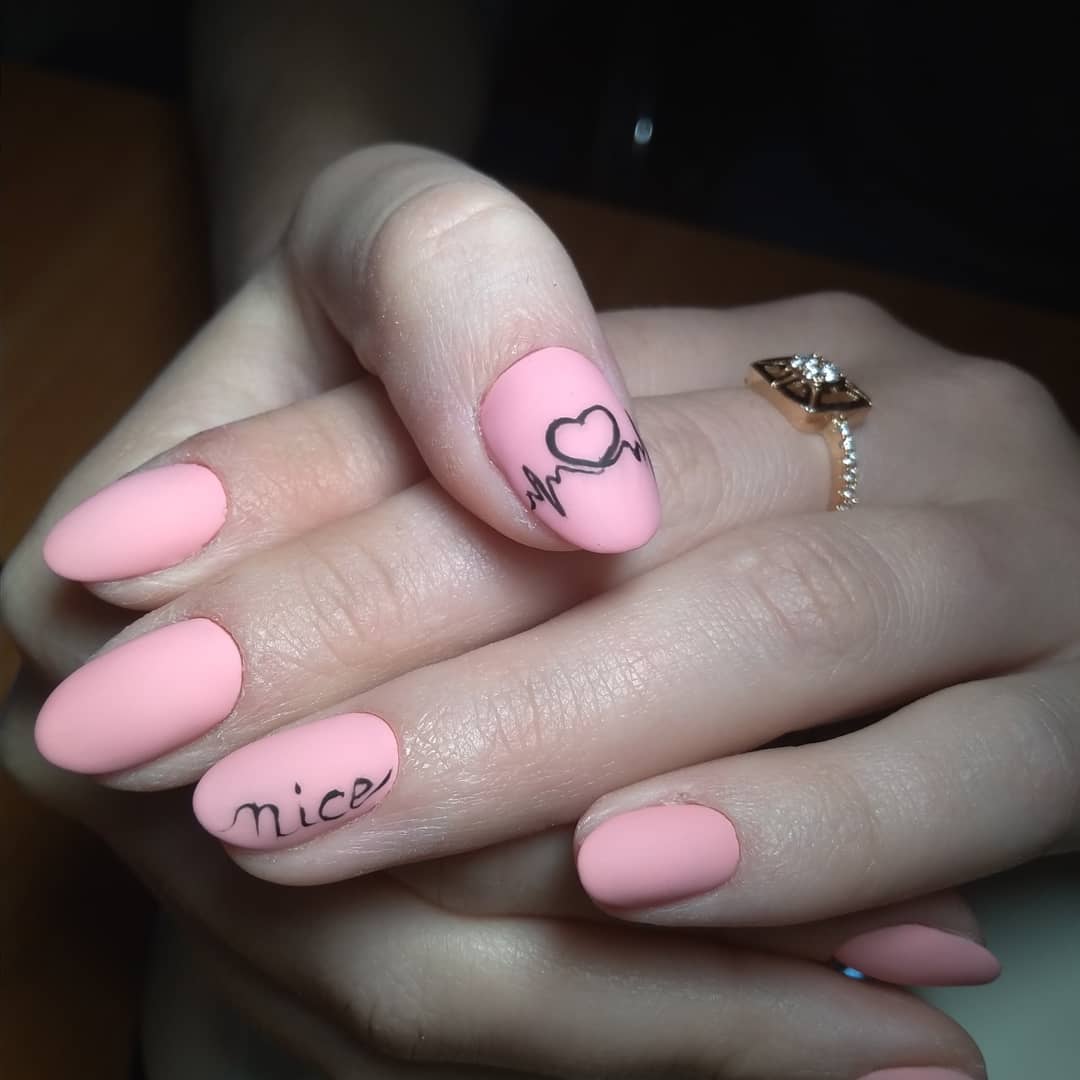 Матовый маникюр — несомненный тренд. На такой базе цифры, буквы и целые выражения будут выглядеть очень стильно и заметно. Глянцевое покрытие часто бликует и не дает передать общий смысл фразы.