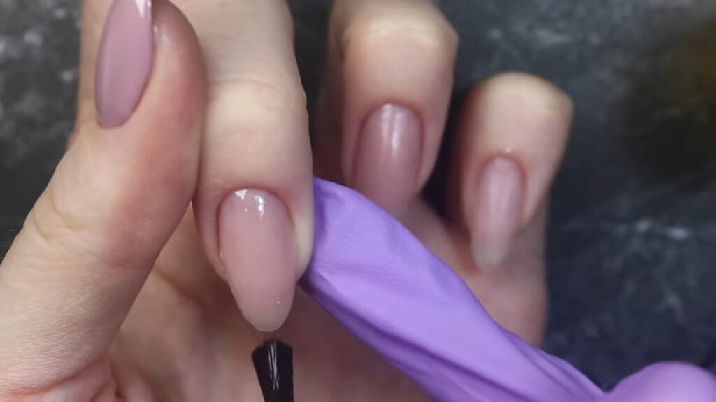 Ногти обезжиривают и наносят прозрачное базовое покрытие – оно поможет лаку держаться дольше.