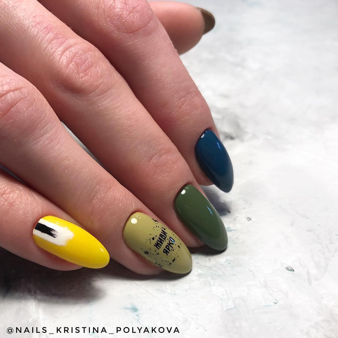 Мастер явно вдохновлялась авокадо, придумывая этот рисунок. Или просто была голодна. Но маникюр получился очень ярким и необычным. А прозрачная основа позволила не скромничать и сделать дизайн на каждом ногте. Будь осторожна: воплощение такой идеи на ногтях может вызвать аппетит!