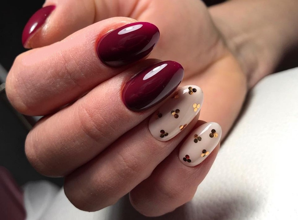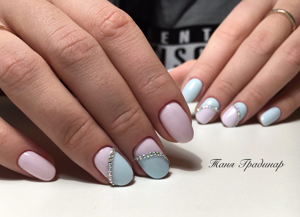 - Минимум цветов. Ты можешь выбрать одно- или двухцветный маникюр. Использование большего количества оттенков оправданно в том случае, если ты каждый ноготь красишь в разные тона одного цвета.