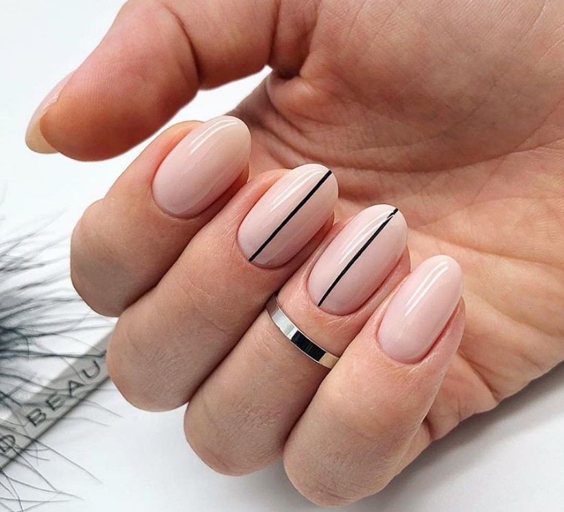 Полоски – еще один несложный, но неизменно эффектный дизайн. Если ты делаешь минималистичный маникюр на короткие ногти, лучше отдать предпочтение вертикальным полосками, которые визуально вытягивают ногтевую пластину. На длинных ноготках можно экспериментировать и с поперечными полосами.