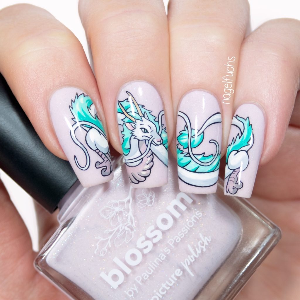 Изобразите на ногтях ярких красивых драконов и маникюр преобразится невероятно. Наносить узоры можно вручную с помощью тонкой кисти и гелевых красок, а можно наклеить готовое изображение в виде слайдеров, и в результате тоже получится очень красивый и праздничный нейл-дизайн.