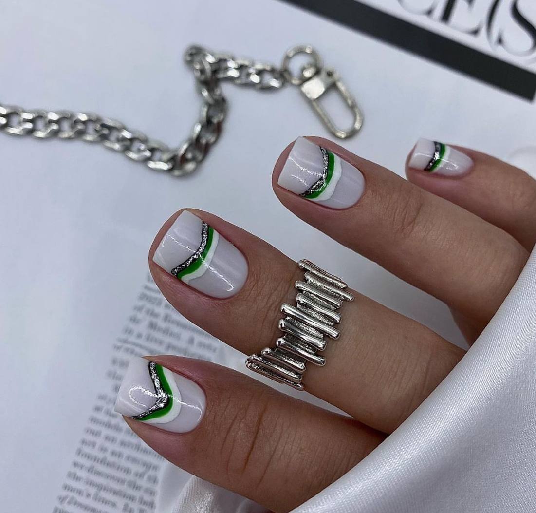 В тренде Года Дракона в нейл-индустрии популярен и серебристый тон. Изысканный маникюр с серебром, яркой пудрой и стразами, фольгой – стильный и модный для года зеленого Дракона. Какие варианты можно реализовать для праздничной вечеринки? Вот несколько свежих идей: