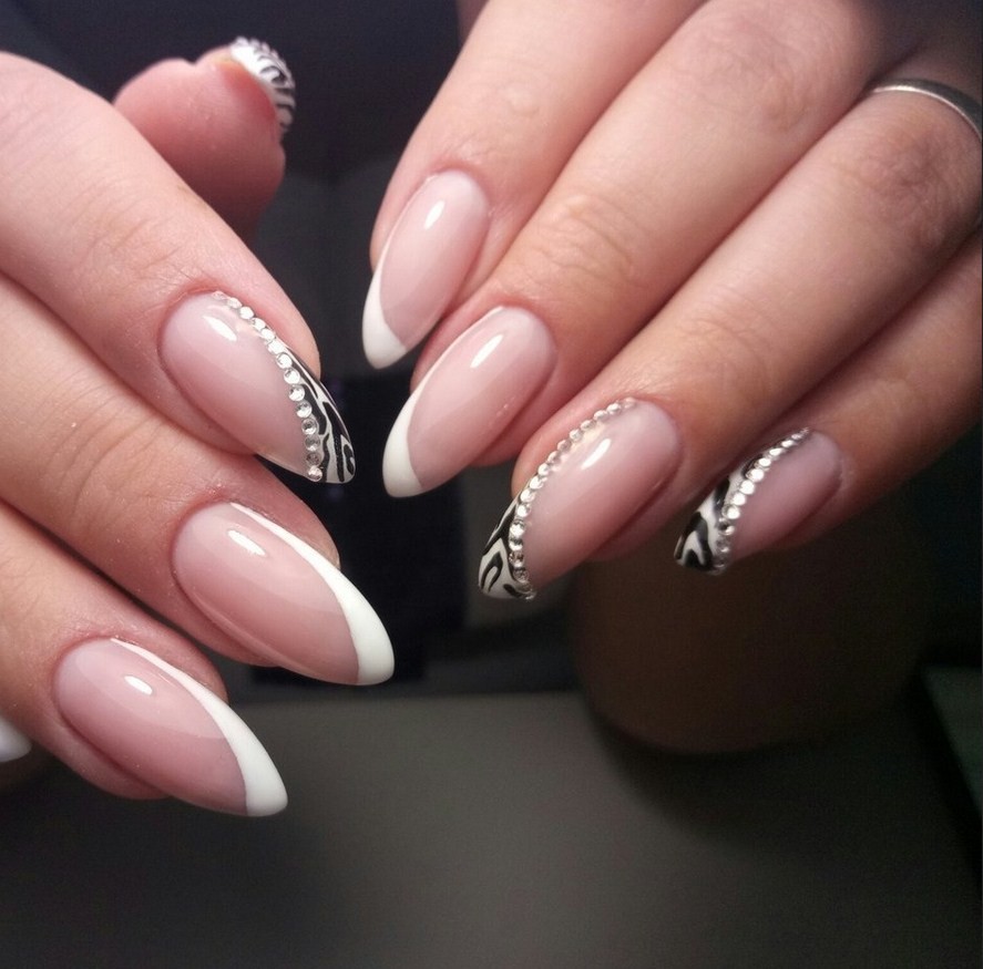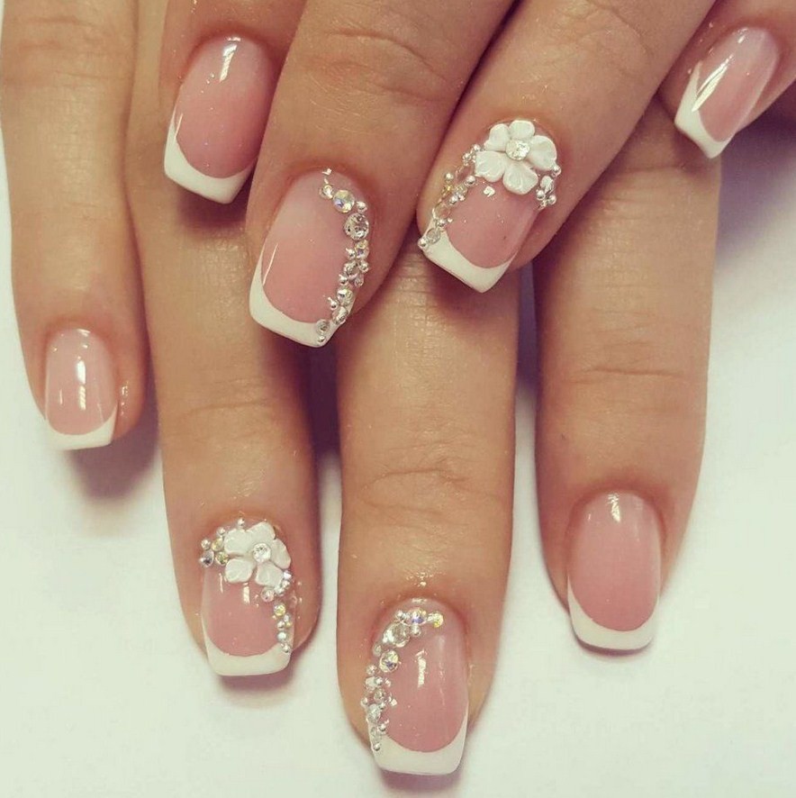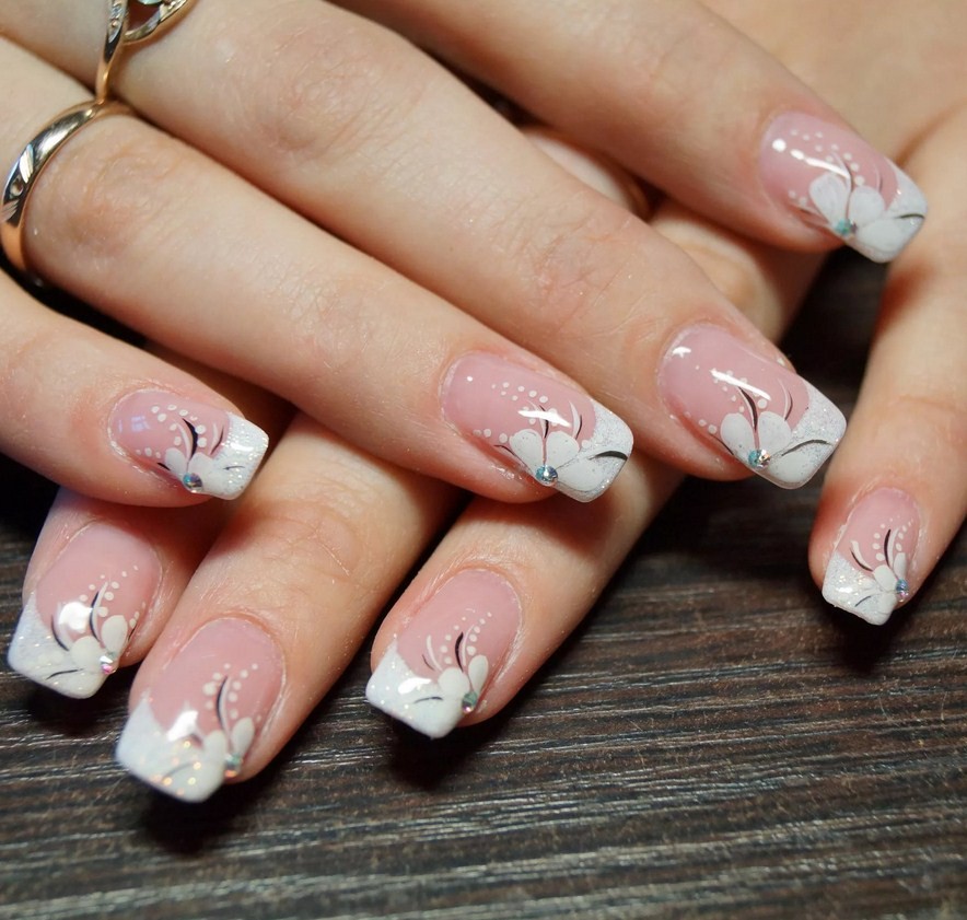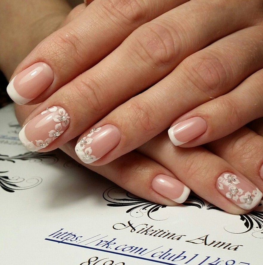 - классическое сочетание белого френча с нежно-розовой подложкой;