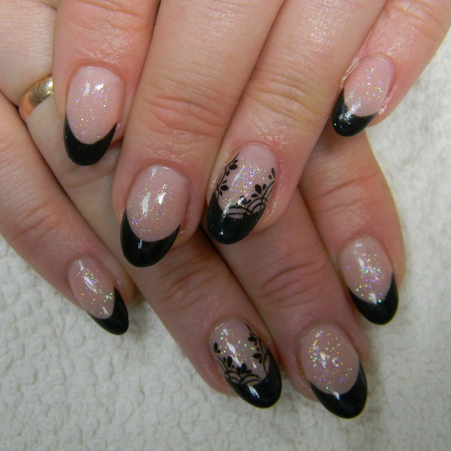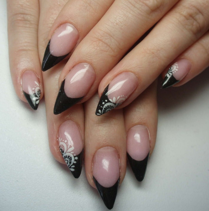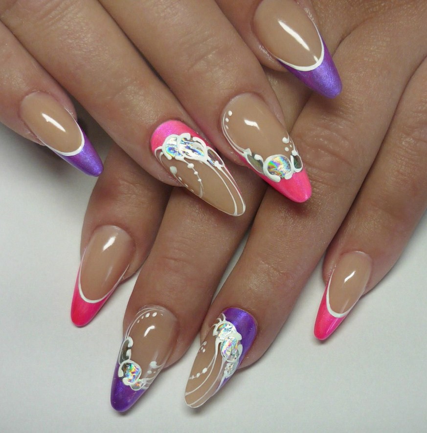 Когда ногти отрасли или наращены, можно сделать форму заостренный «миндаль». При моделировании френча в салоне могут предложить аквариумный дизайн, выкладной френч или в другой технике. Например, нарисовать тонкие полоски-обводки по форме кончиков ногтей.
