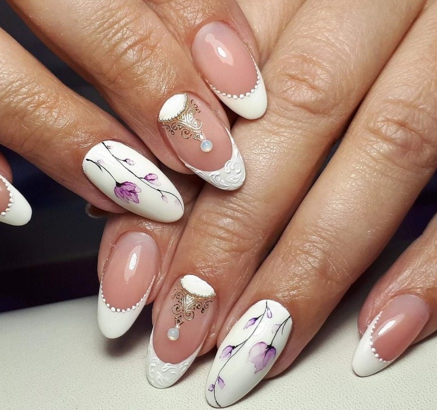 - цветы в качестве дополнительного дизайна — на 1-2 пальцах полевые цветы в нежных тонах, на остальных нанесен френч;