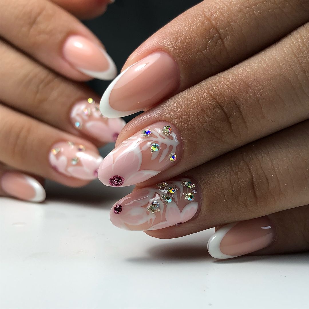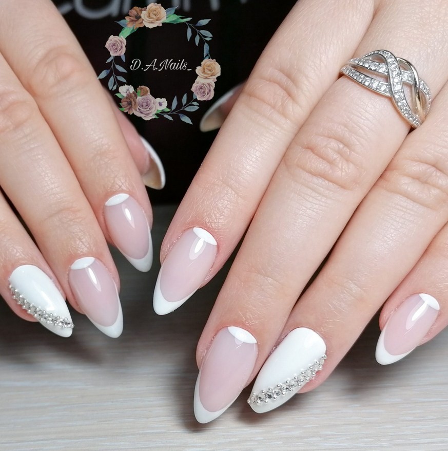 Не сомневайтесь, утонченная и удлиненная форма ногтей «балерина» актуальна. Дизайн в стиле френча, украшенный жемчугом, жемчужной втиркой, объемными элементами из прозрачного геля или стразами. Декорирование идеально впишется в такой изящный маникюр. Также французский маникюр на форму «балерина» можно оформить в стиле градиент или минимализм.