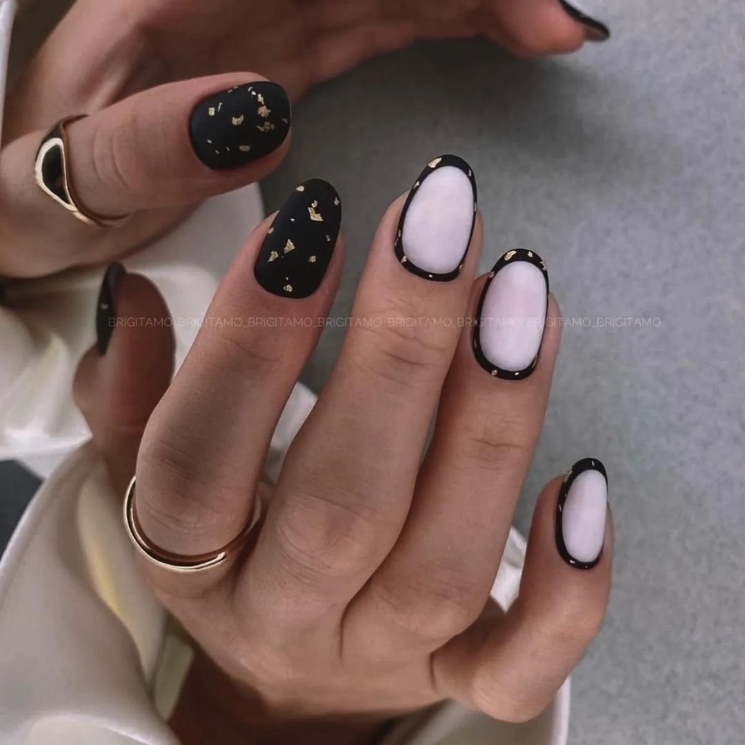 - Праздничный френч 2024 с черной основой и золотым (лак, фольга) свободным крем ногтя. Любая матовая основа и краешек цвета «хромированный металлик». Это сочетание выбирают и для ногтевого пирсинга, любительницам всего экстравагантного.