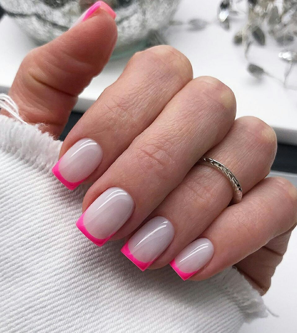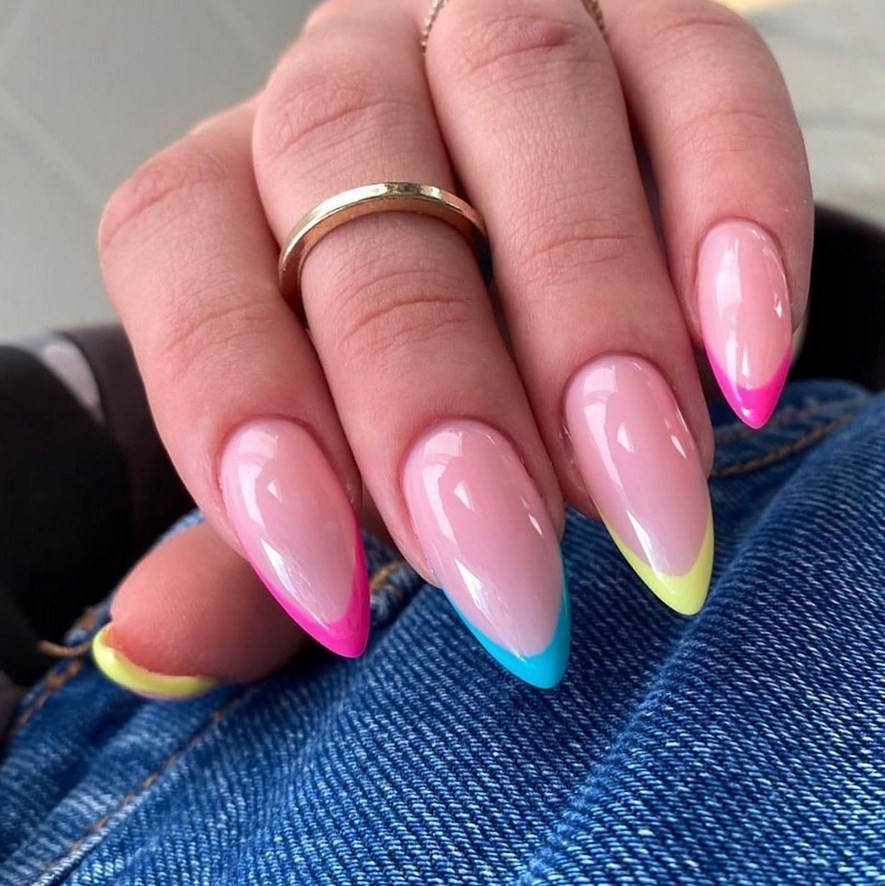 В летние месяцы девушкам хочется легких образов и ярких красок. Сезон с июня по август в 2023 году станет исключение для отказа от разноцветных гель-лаков. В создании френча можно использовать даже кислотные цвета. К наиболее стильным вариантам сочетания относятся: