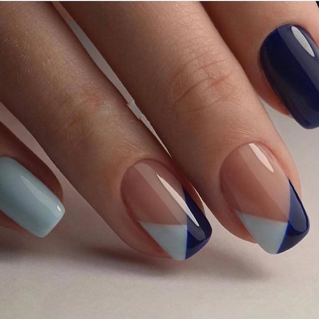 Этот дизайн включает геометрические формы, такие как треугольники, линии, и другие графические элементы в дизайне френч. Это может создать современный и стильный вид, особенно в сочетании с современными цветами и текстурами.