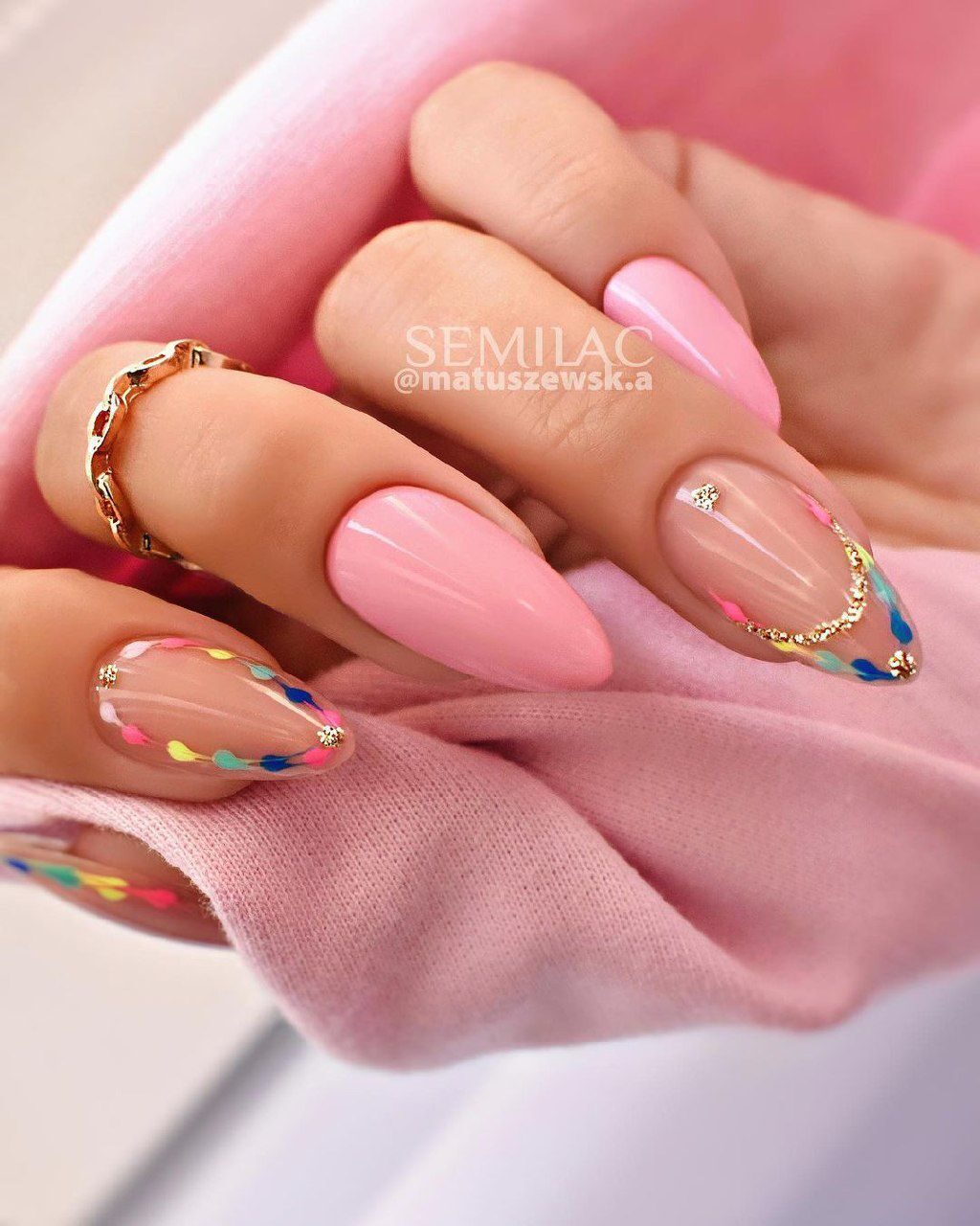 Вместо улыбки — аккуратный V-образный кончик, окрашенный в любой цвет. Лучше всего подойдет овальная и миндалевидная форма. Покрытие производится тонкой или круглой кистью. Он может быть однотонным или разноцветным. Довольно часто девушки любят украшать его блестками или горошком. Можно добавить сразу несколько геометрических полосок, чтобы создать необычную улыбку.