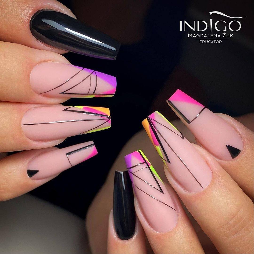Еще одним оригинальным и неповторимым дизайном в грядущих сезонах будет дерзкая и яркая абстракция. Используя популярные цвета и оттенки этих сезонов, можно оформить маникюр с красивыми случайными мазками, цветными брызгами и различными незатейливыми надписями, а также с использованием геометрии. Такая яркая абстракция может стать яркой альтернативой геометрического дизайна в следующем модном нейл-сезоне.