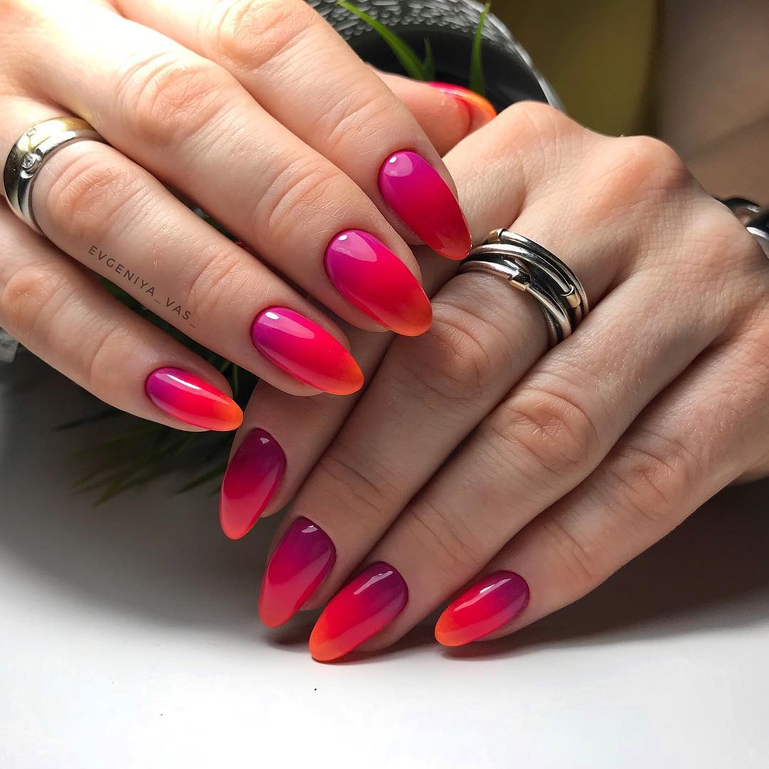 Эти оттенки можно комбинировать с другими, создавая причудливые дизайны и узоры, а можно сделать однотонное покрытие. Яркие цвета лаков будут напоминать о солнечных летних днях и не дадут заскучать, а если добавить к ним немного блеска, то в пасмурные осенние дни такой маникюр будет смотреться выигрышно и подчеркнет весь образ.