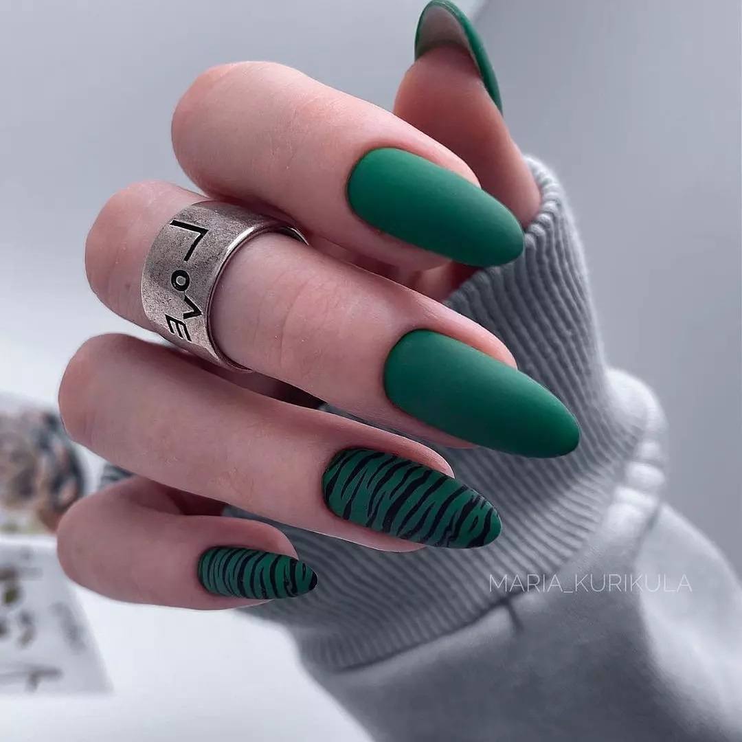 Темно-зеленый – это идеальный выбор для ноябрьского маникюра, потому что он напоминает о зимнем лесе и добавляет к маникюру ощущение свежести и натуральности. Такой оттенок зеленого можно сочетать с другими зимними цветами, такими как серый и бежевый.