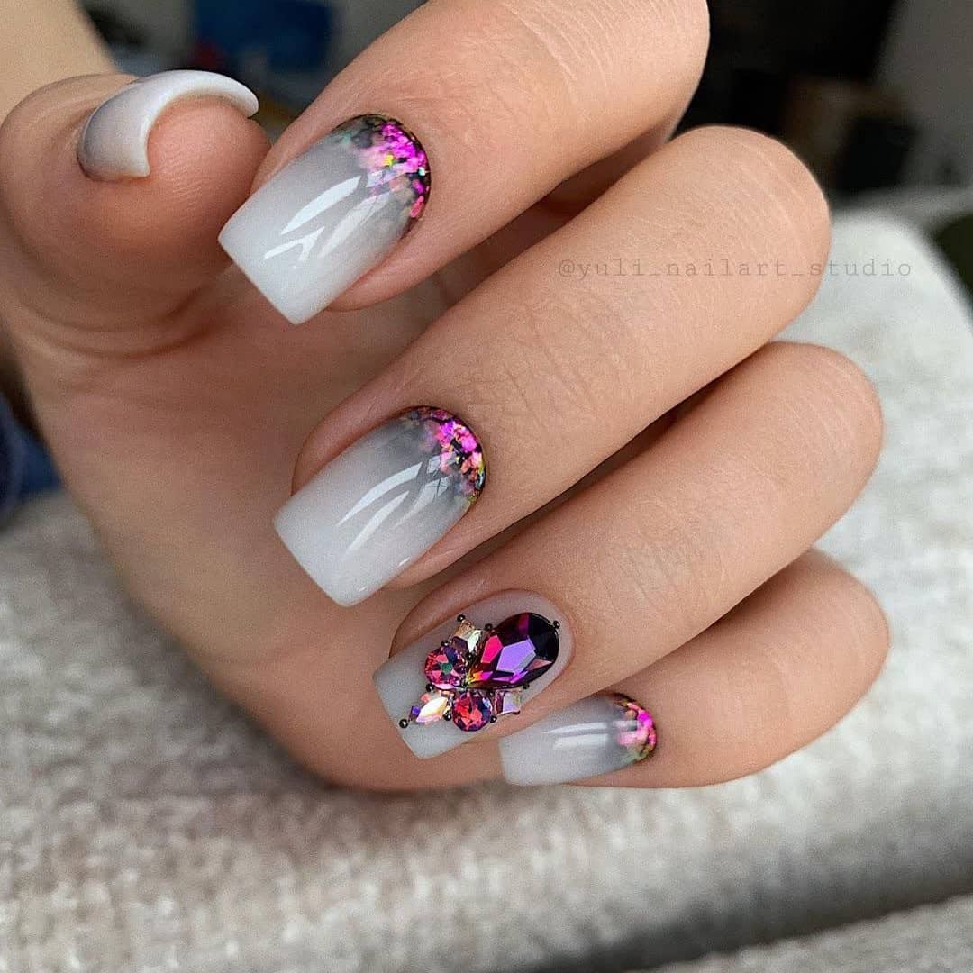 Здесь улыбка формируется основания ноготков. Цвета украшений могут быть любыми. В качестве оформления можно выбрать фото или лепнину. Лунный нейл-арт чаще всего используют невесты. Такая укладка ногтей занимает много времени и требует многоступенчатой работы профессионалов.