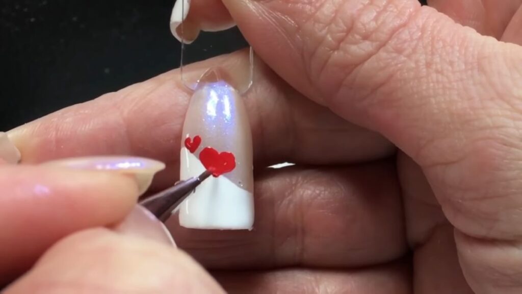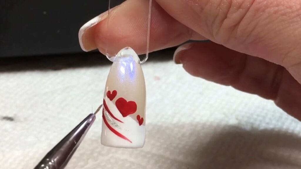 Можно применить популярный эффект омбре в сердце. Используйте для перехода цветов красный и розовый. А чтобы рисунок был максимально четким, то используйте трафареты в форме сердца. На них с помощью губки наносите двухцветное покрытие, чтобы создать плавный переход.