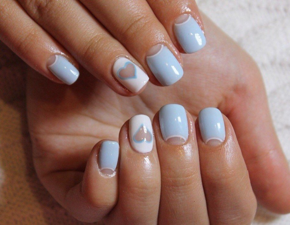 Сердечки могут быть в виде прозрачного силуэте на основном цвете. Этот вариант подойдет для девушек, которые хотят, чтобы маникюр выглядел лаконично. Прозрачные сердца прекрасно сочетаются с любым цветом покрытия.