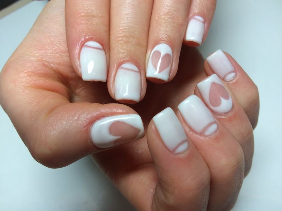 Белый цвет всегда считается воплощением нежности и чистоты. Поэтому для лаконичного дизайна ногтей часто выбирают именно этот вариант. Кроме того, он является базовым и подходит для создания практически любого дизайна. Романтические, нежные сердечки на таком цвете смотрятся потрясающе красиво.