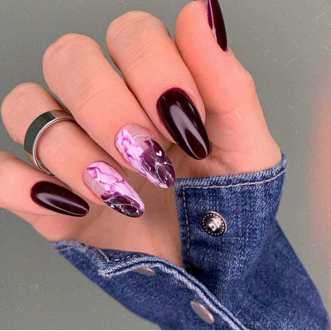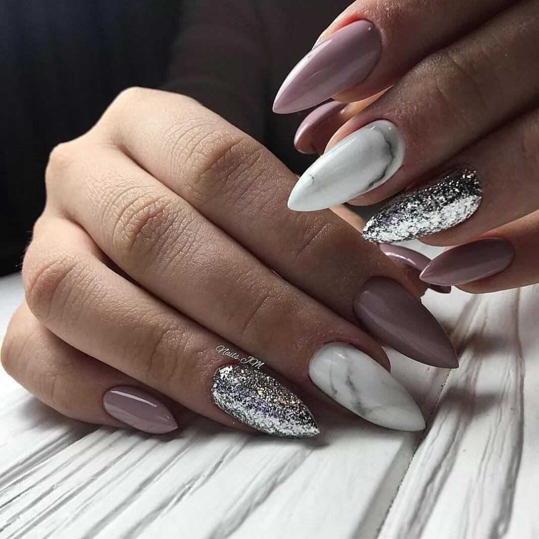 Этот маникюр оценят любительницы минимализма. Маникюр повторяющий прожилки благородного камня уже почти-что стал классикой.