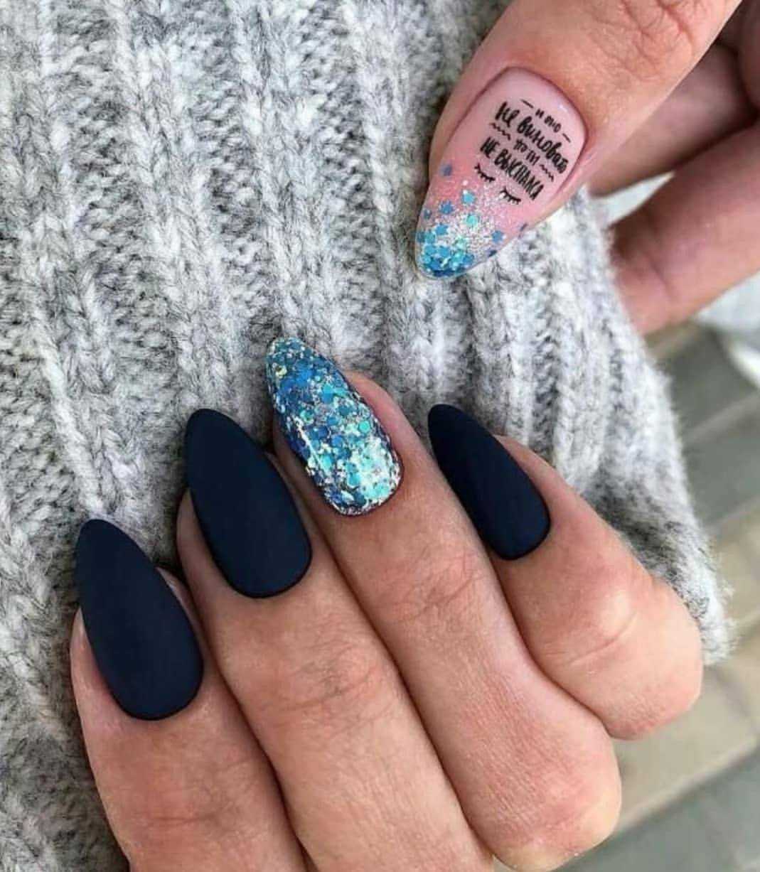 Такой маникюр привлекает внимание, показывает индивидуальность девушек. Маникюр с надписями легко выполняется с помощью маникюрных кистей и стемпинга. Отлично смотрится маникюр со слайдерами на прозрачной основе, которые можно дополнить пайетками или глиттером
