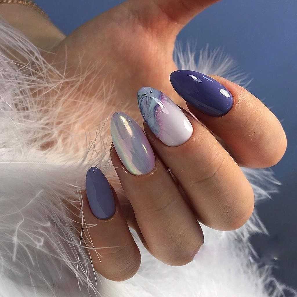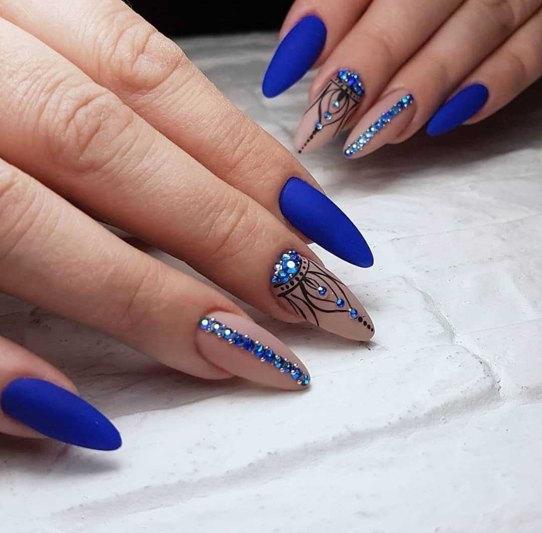 Такой дизайн ногтей не привлечет внимание, напротив, он рискует вызвать отторжение. Если любовь к синему лаку велика, допустимо использовать его в качестве акцентов в комбинации с располагающим бежевым цветом