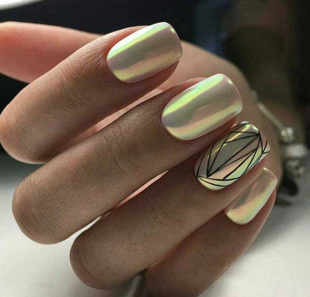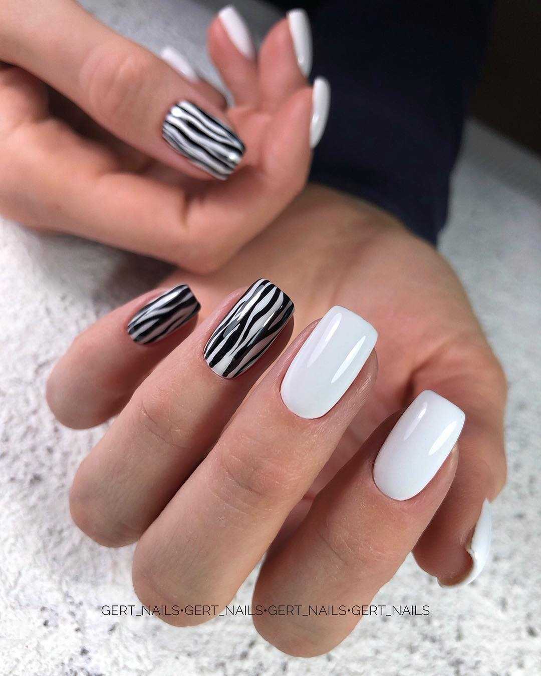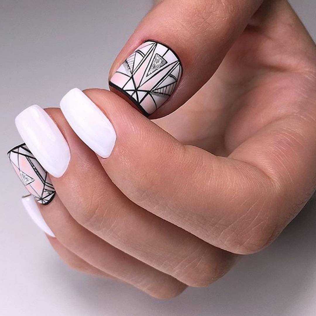 При выборе этого дизайна лучше придерживаться минимализма. Популярные варианты маникюра – черная клетка на белом фоне, композиция из линий и треугольников.