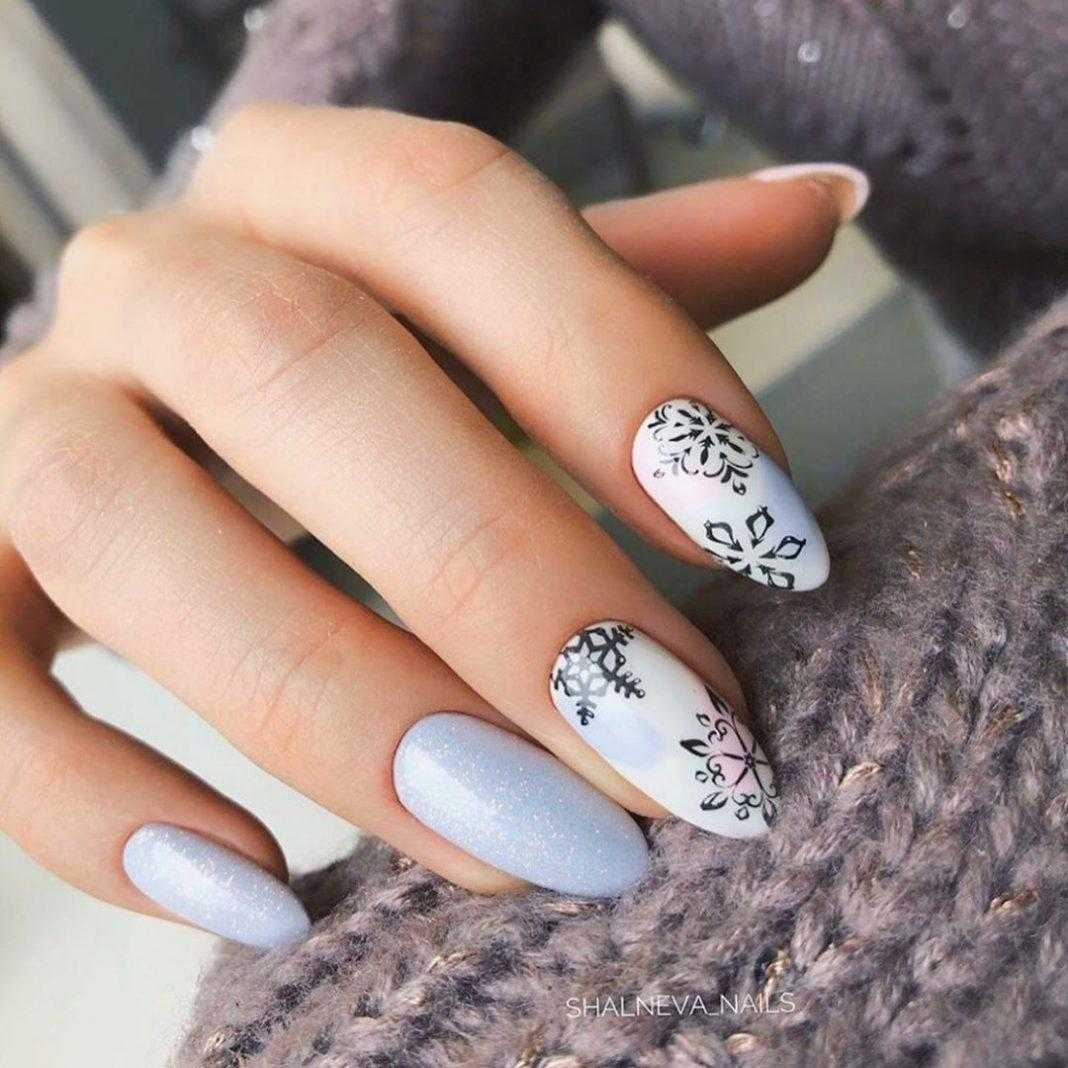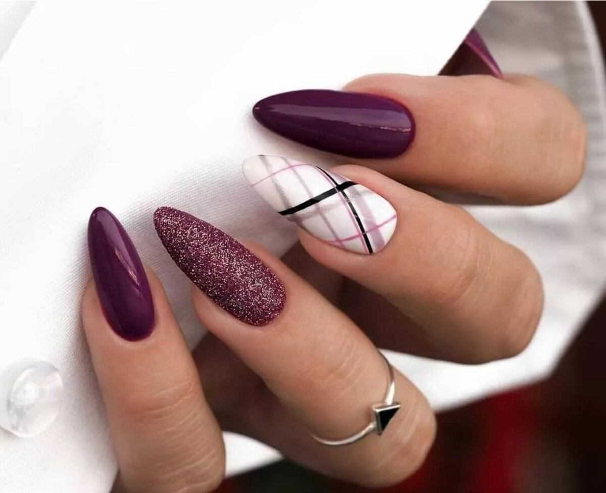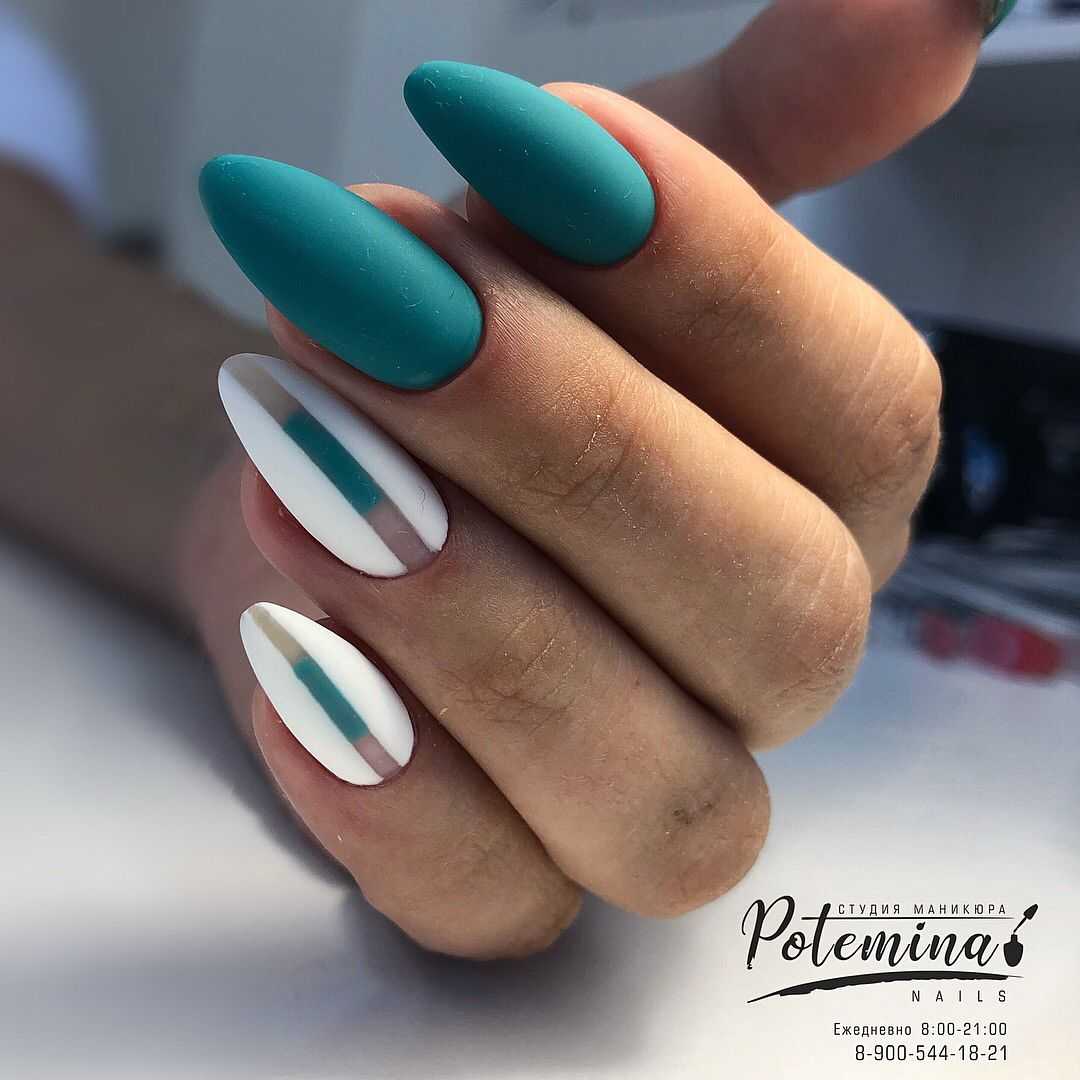 При выборе этого дизайна лучше придерживаться минимализма. Популярные варианты маникюра – черная клетка на белом фоне, композиция из линий и треугольников.