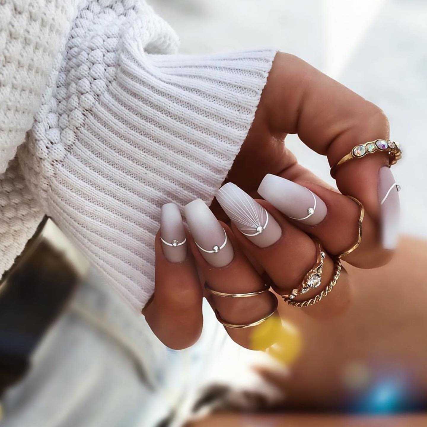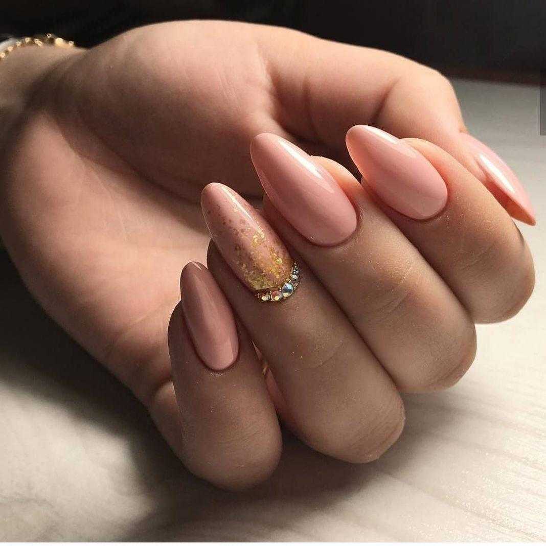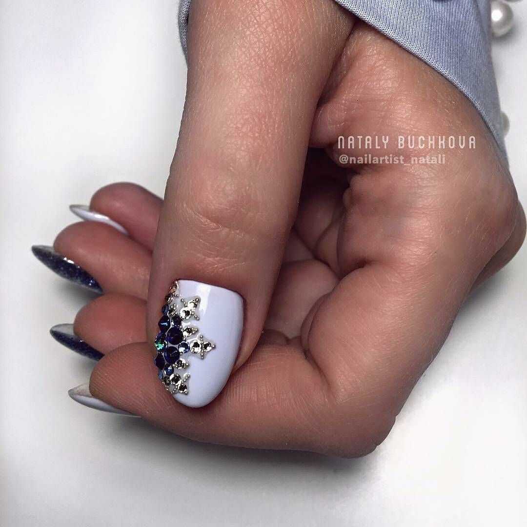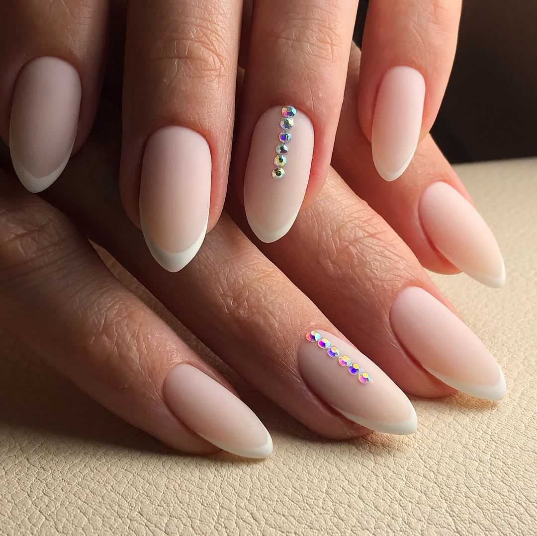 Маникюр в виде аккуратных страз или бусин с легким блеском способен сделать удачный акцент в маникюре, и образ не будет выглядеть скучным.