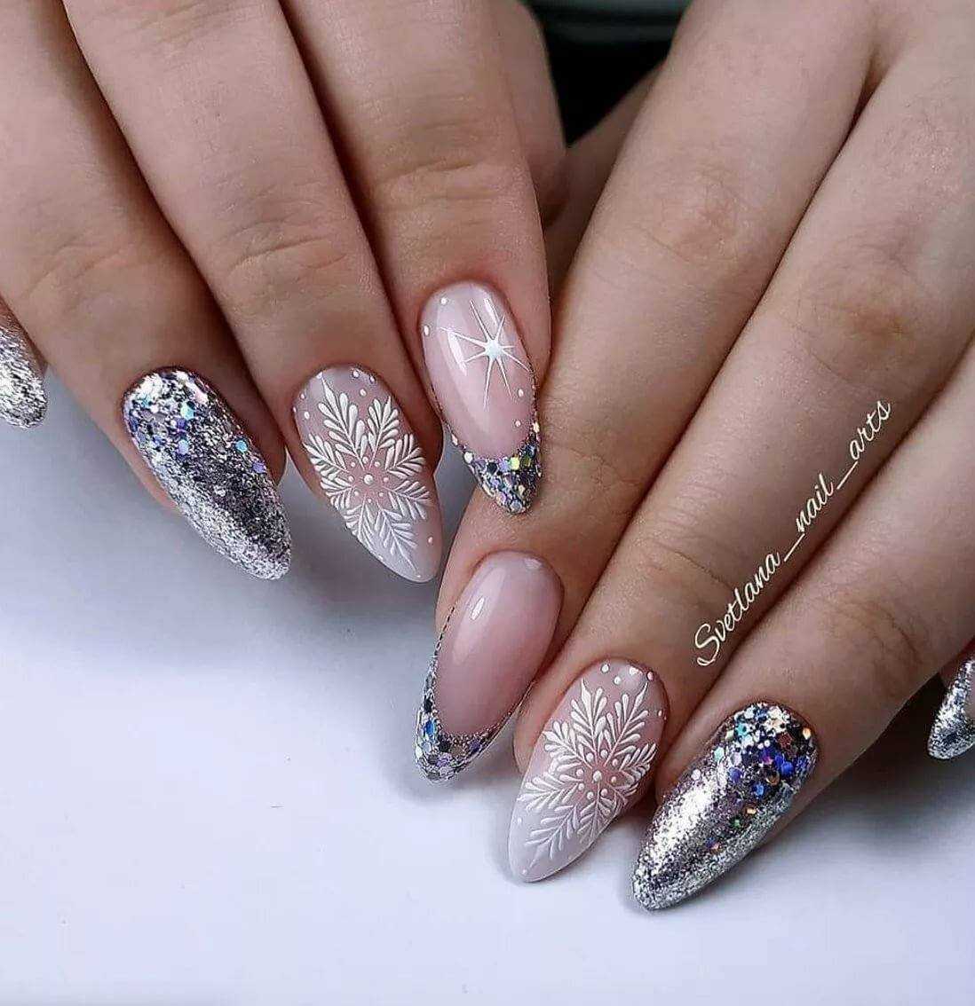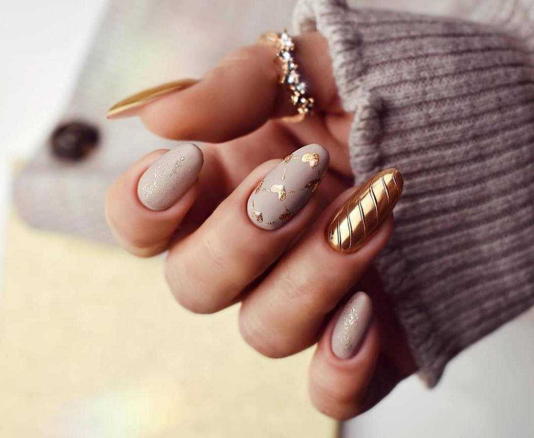 Хаотично разбросанные по пластине элементы серебристой или золотой фольги придают маникюру особой элегантности, что очень нравится парням. Специалисты рекомендуют комбинировать их с бежевым или молочным лаком.