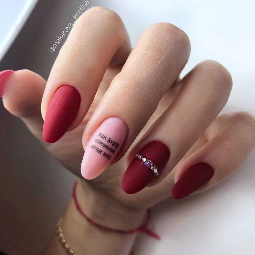 Надписи на ногтях смотрятся достаточно сложно, поэтому остальные ноготки должны быть выполнены в стиле минимализм с однотонным окрашиванием ногтей